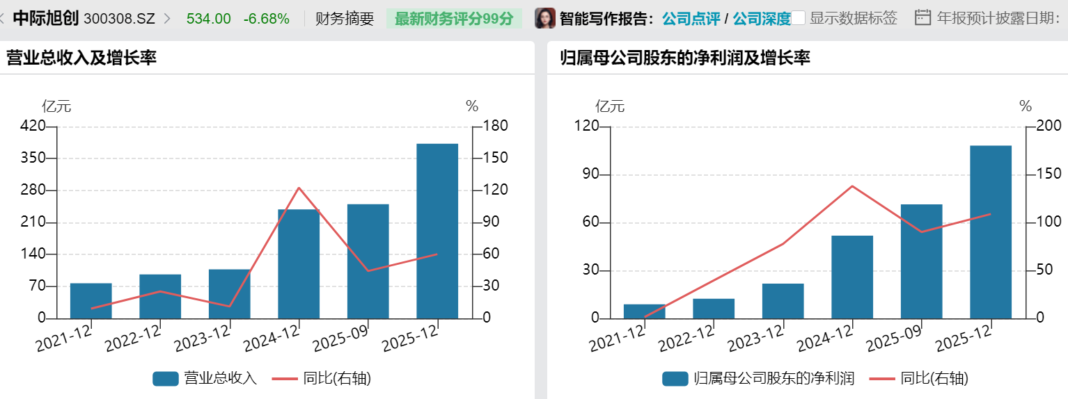 财务数据显示,2025年,中际旭创实现营业总收入382.4亿元,同比增长60.25%;实现归母净利润107.99亿元,同比增长108.81%;截至2025年末,公司总资产为455.29亿元,较期初增长57.72%;净资产为300.04亿元,较期初增长56.81%。