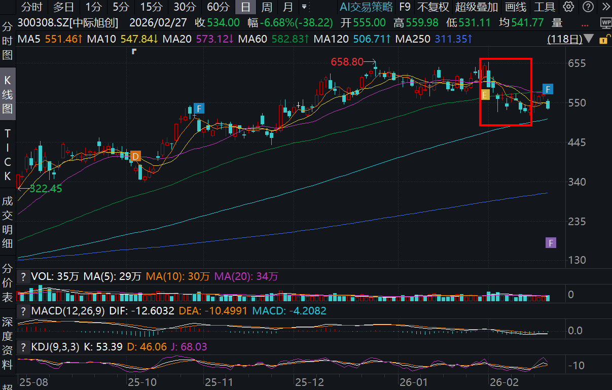 二级市场上,中际旭创股价于2025年12月25日触及658.8元的历史最高价,市值达7109亿元;2026年2月后,其股价下跌显著。其中,2月2日至2月12日区间,股价跌幅达18.73%。截至2月12日收盘,公司股价报收于527.46元。