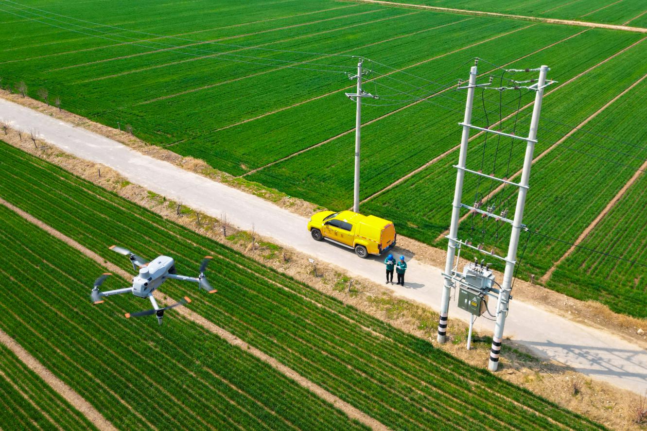 图为国网聊城供电公司工作人员使用无人机对涉农线路开展巡视检查