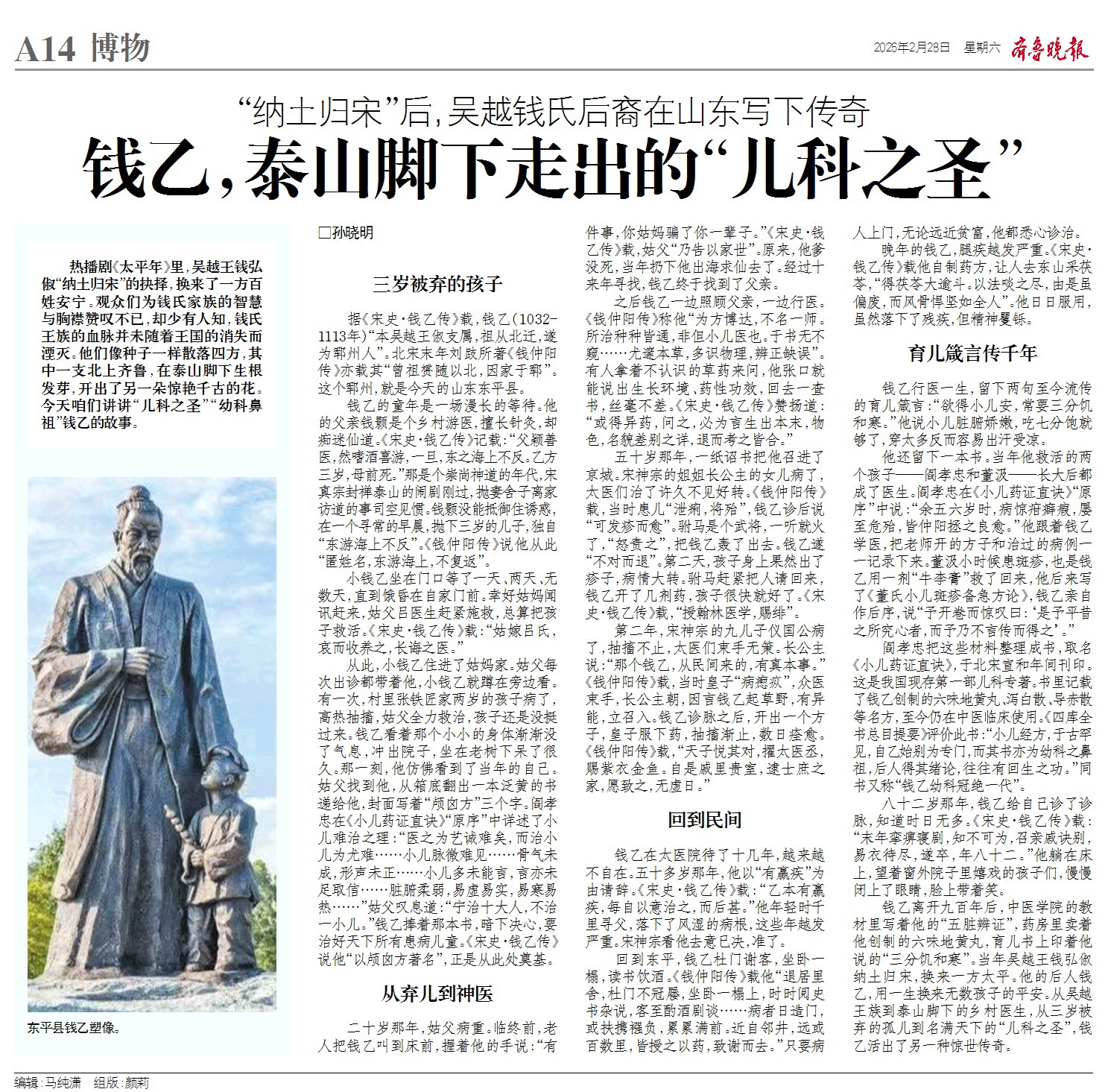 热播剧《太平年》里,吴越王钱弘俶“纳土归宋”的抉择,换来了一方百姓安宁。观众们为钱氏家族的智慧与胸襟赞叹不已,却少有人知,钱氏王族的血脉并未随着王国的消失而湮灭。他们像种子一样散落四方,其中一支北上齐鲁,在泰山脚下生根发芽,开出了另一朵惊艳千古的花。今天咱们讲讲“儿科之圣”“幼科鼻祖”钱乙的故事。