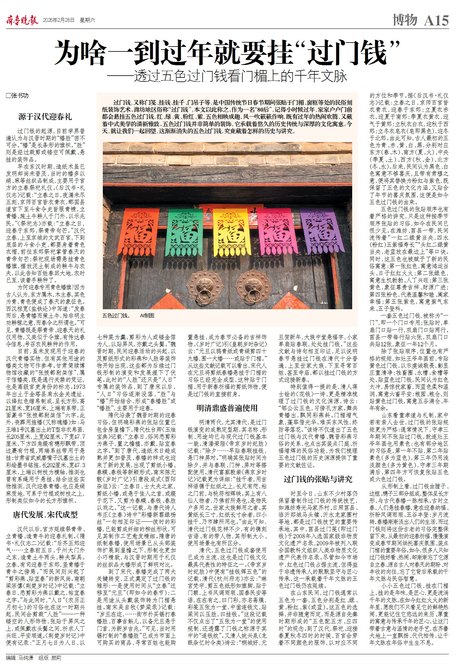 小小五色过门钱,挂在门楣上,挂的是年味,是匠心,更是流淌千年的文脉。在如今红红火火的新年里,愿我们不只看见它的鲜艳热闹,更能记住它悠远的来历、厚重的寓意与传承千年的匠心,让这门带着古意与温情的老手艺,在齐鲁大地上一直飘扬、代代相传,让千年文脉在年俗中生生不息。
