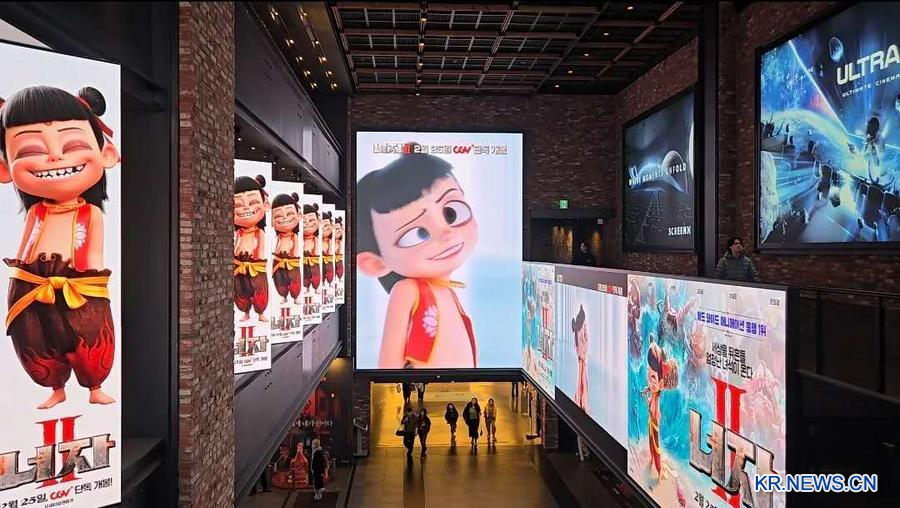 '너자(哪吒)2'의 개봉일인 25일 한국 서울 용산 CGV에 걸린 홍보 화면. (사진/신화통신)