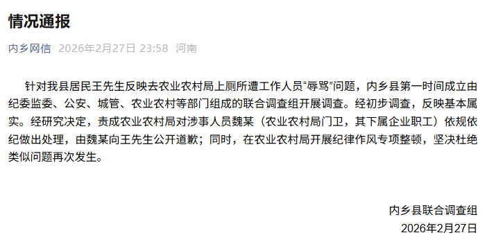 此前,河南省南阳市内乡县居民王先生近日在社交平台发布视频称,自己去县农业农村局上厕所时遭工作人员“辱骂”。