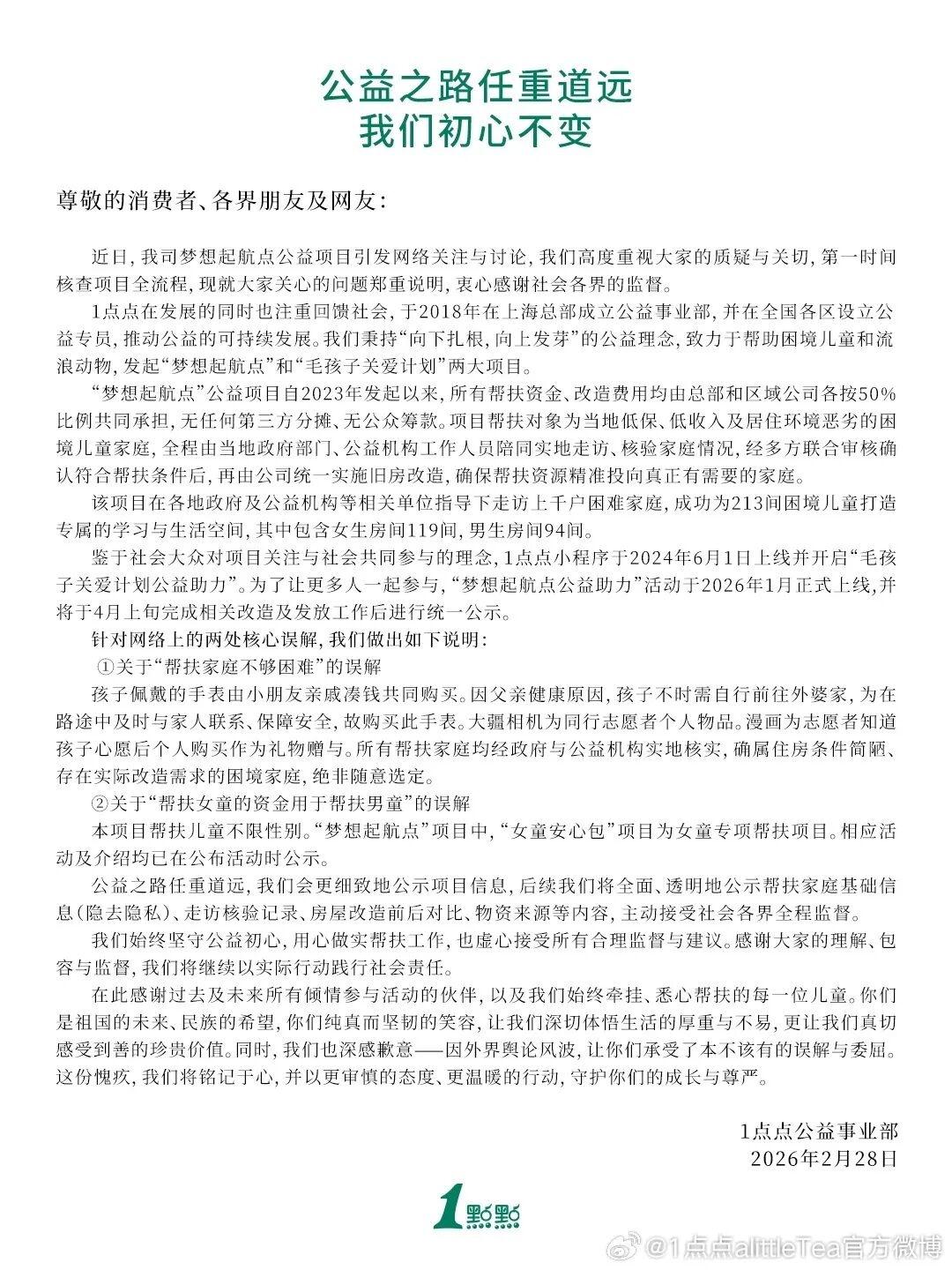 据白鹿视频,2月28日,奶茶品牌“一点点”发文回应“资助男孩戴千元手表”等争议问题。