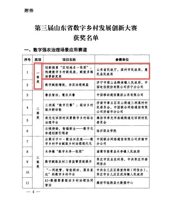 近日,第三届山东省数字乡村发展创新大赛获奖名单公布。滨州市与省民政厅、惠民县民政局共同完成的《创新探索“区划地名一张图”,构建数字乡村新底座,赋能多维场景新发展》项目,经过多轮评审与角逐,在“数字强农治理赛道”中荣获一等奖。