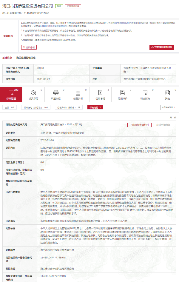 日前,信用中国公示了海口市路桥建设投资有限公司的行政处罚决定。行政处罚决定书文号海口秀英综执普罚决字﹝2026﹞第13号显示,该公司违法事实为未经批准或者采取欺骗手段骗取批准或者超过批准的数量,非法占用土地。