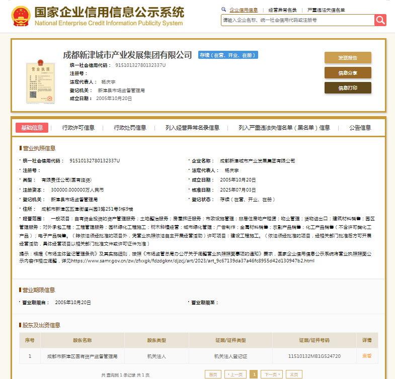 国家企业信用信息公示系统显示,成都新津城市产业发展集团有限公司成立于2005年,注册资本300000万元人民币,法定代表人杨庆宇,由成都市新津区国有资产监督管理局全资持股,后者是重庆高速巨能建设集团有限公司的全资子公司。