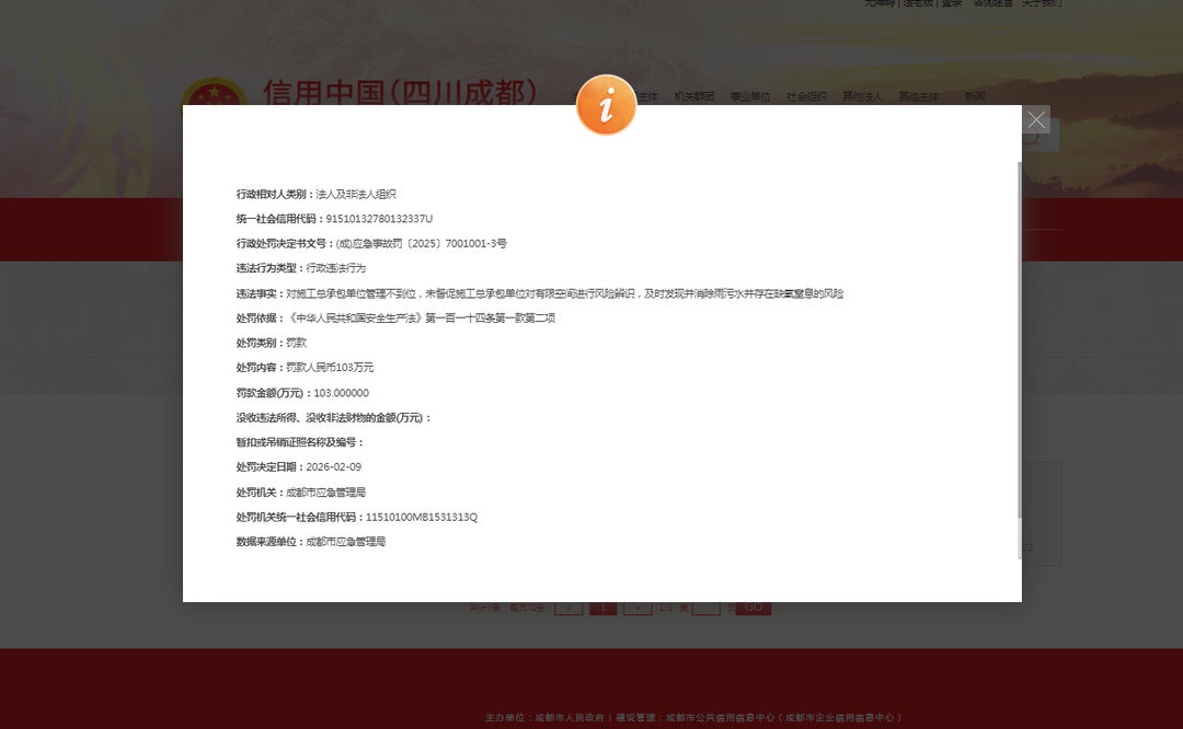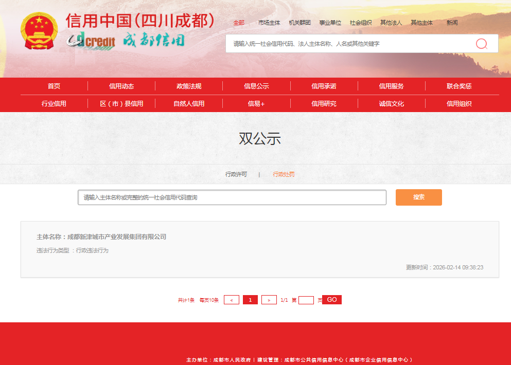 齐鲁晚报·齐鲁壹点记者于信用中国(四川成都)双公示栏获悉,2月9日,成都市新津区国有资产监督管理局全资持股的成都新津城市产业发展集团有限公司(下称“新津城市产发集团”)因违反《中华人民共和国安全生产法》相关规定,收到103万元罚单,处罚机关为成都市应急管理局。