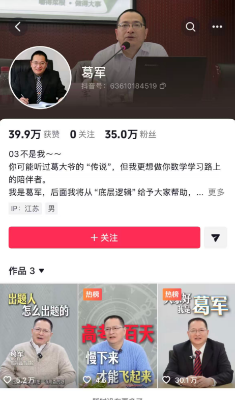 高考数学命题老师葛军入驻抖音,一天涨粉35万,网友:我已经上班了,不怕你了