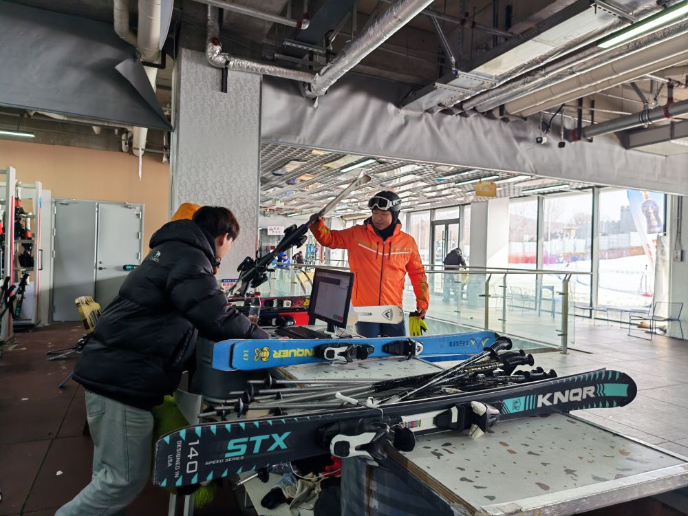 夹谷关滑雪场中,滑雪爱好者正在租雪具。新华社记者 张武岳 摄