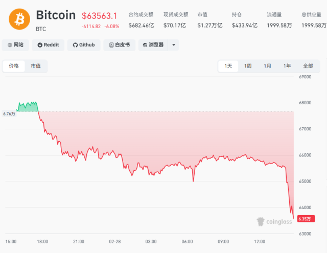 比特币直线跳水跌破64000美元,24小时内跌超6%