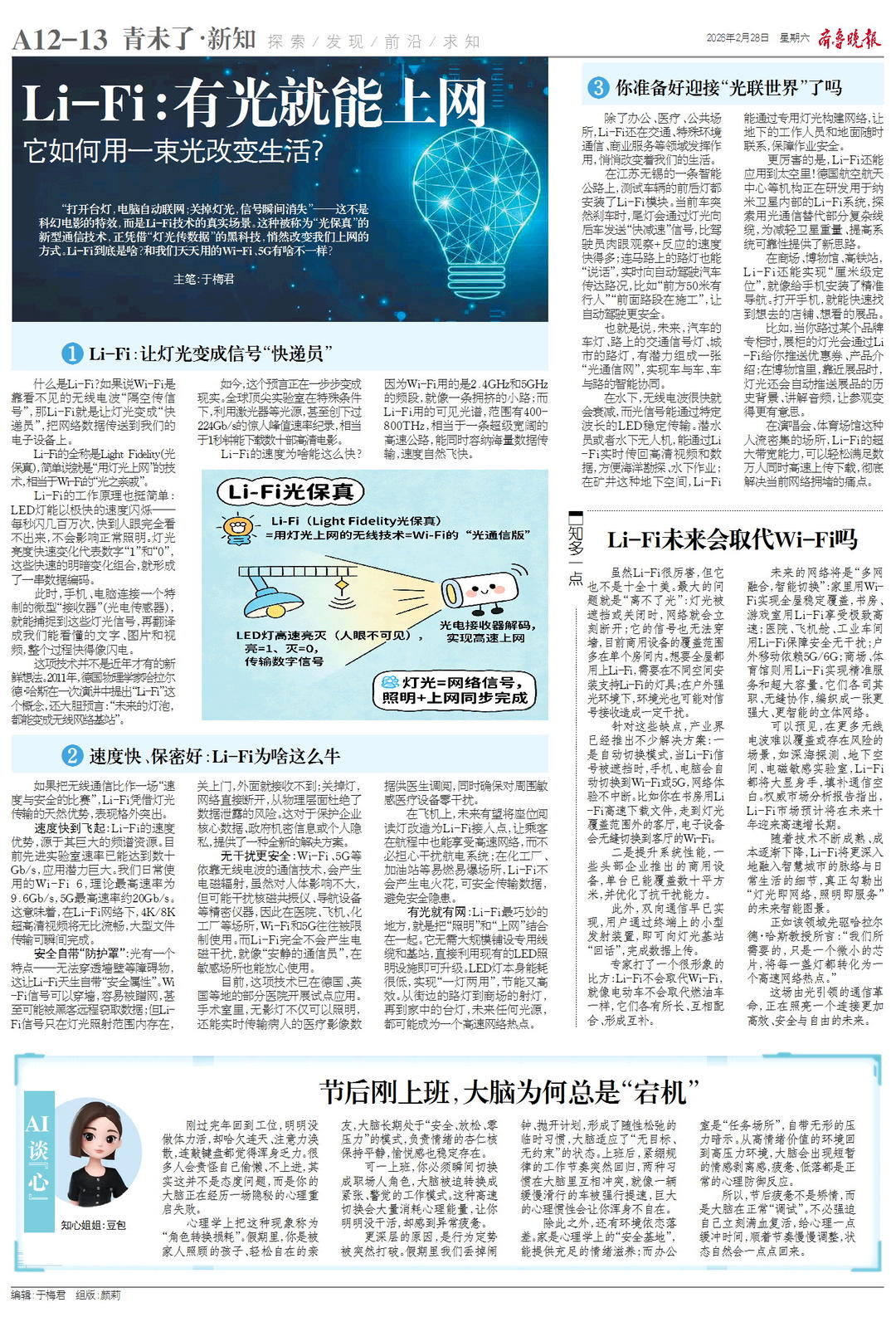 在江苏无锡的一条智能公路上,测试车辆的前后灯都装了Li-Fi模块。当前车突然刹车时,尾灯会通过灯光向后车发送“快减速”信号,比传统刹车灯的反应速度快得多;连马路上的路灯也能“说话”,实时向自动驾驶汽车传达路况,比如“前方50米有行人”“前面路段在施工”,让自动驾驶更安全。也就是说,未来,汽车的车灯、路上的交通信号灯、城市的路灯,有潜力组成一张“光通信网”,实现车与车、车与路的智能协同。