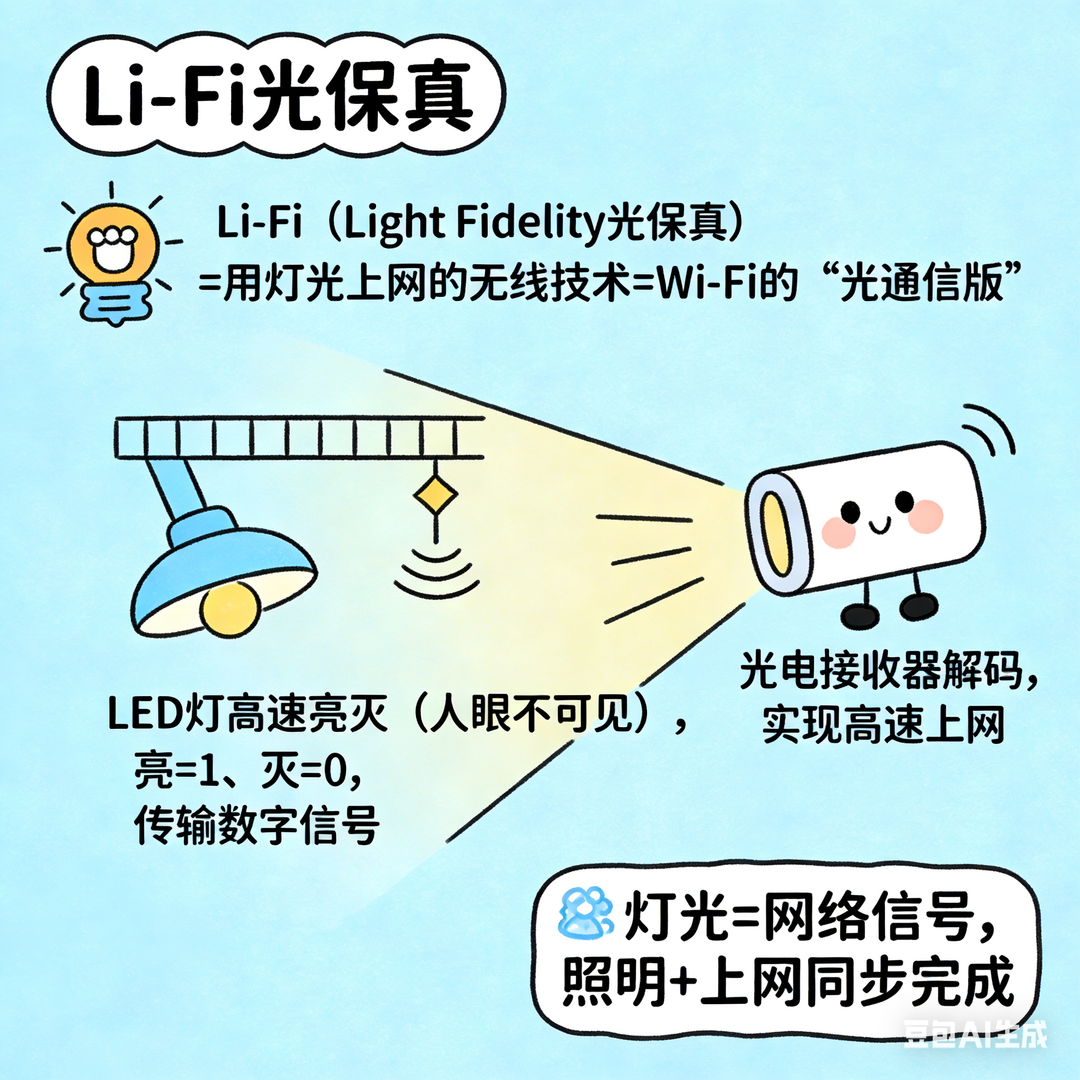 “打开台灯,电脑自动联网;关掉灯光,信号瞬间消失”——这不是科幻电影的特效,而是Li-Fi技术的真实场景。这种被称为“光保真”的新型通信技术,正凭借“灯光传数据”的黑科技,悄然改变我们上网的方式。Li-Fi到底是啥?和我们天天用的Wi-Fi、5G有啥不一样?