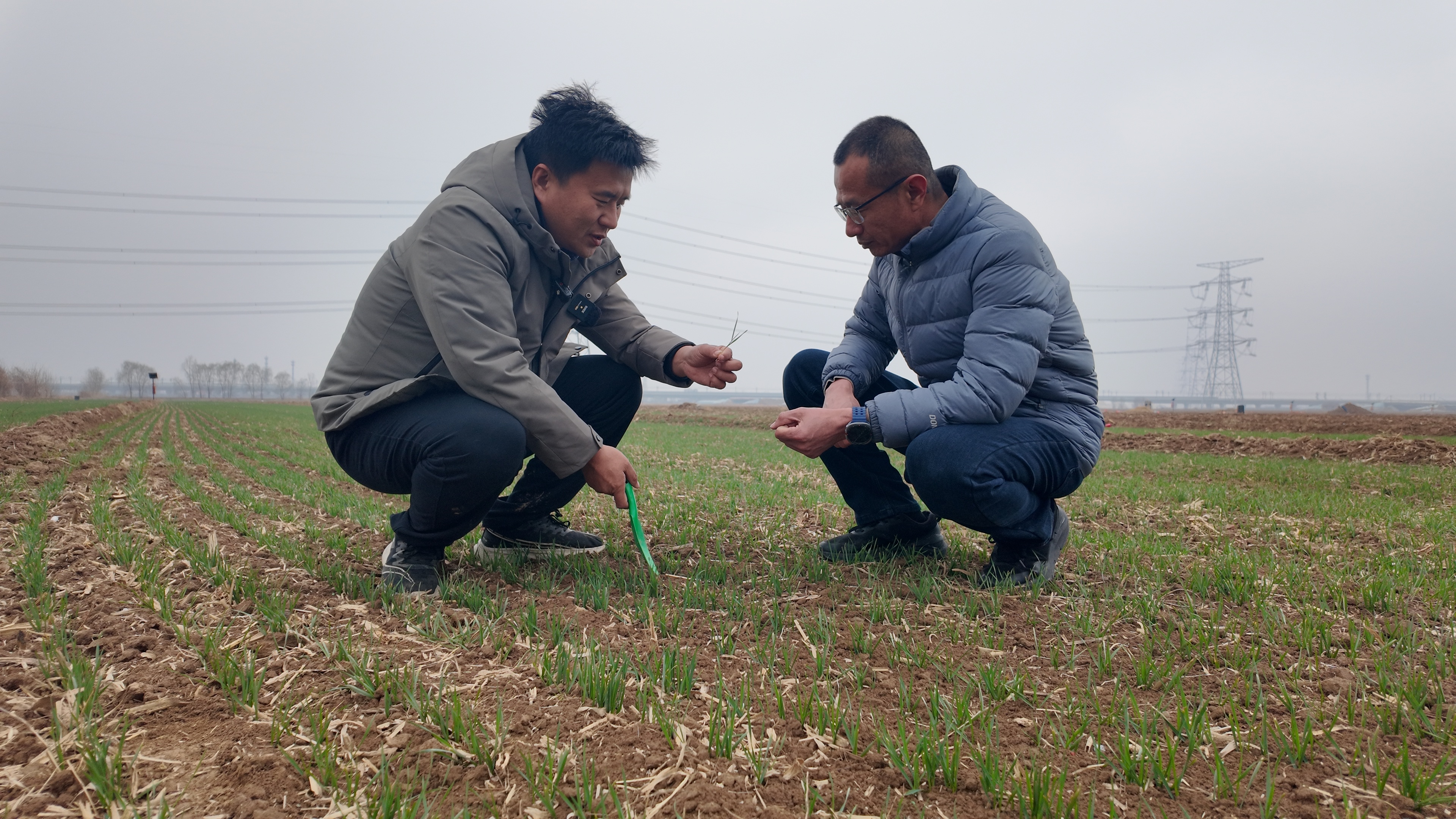2月26日,德州市农业科学院正高级农艺师赵文路一行,来到陵城区丰润农场的麦田里查看苗情。“这块地播种属于最晚的一批,目前是两叶一心的状态,但是小麦群体充足。”赵文路分析并建议,“在返青期开沟追施一遍尿素或者小麦专用复合肥”。
