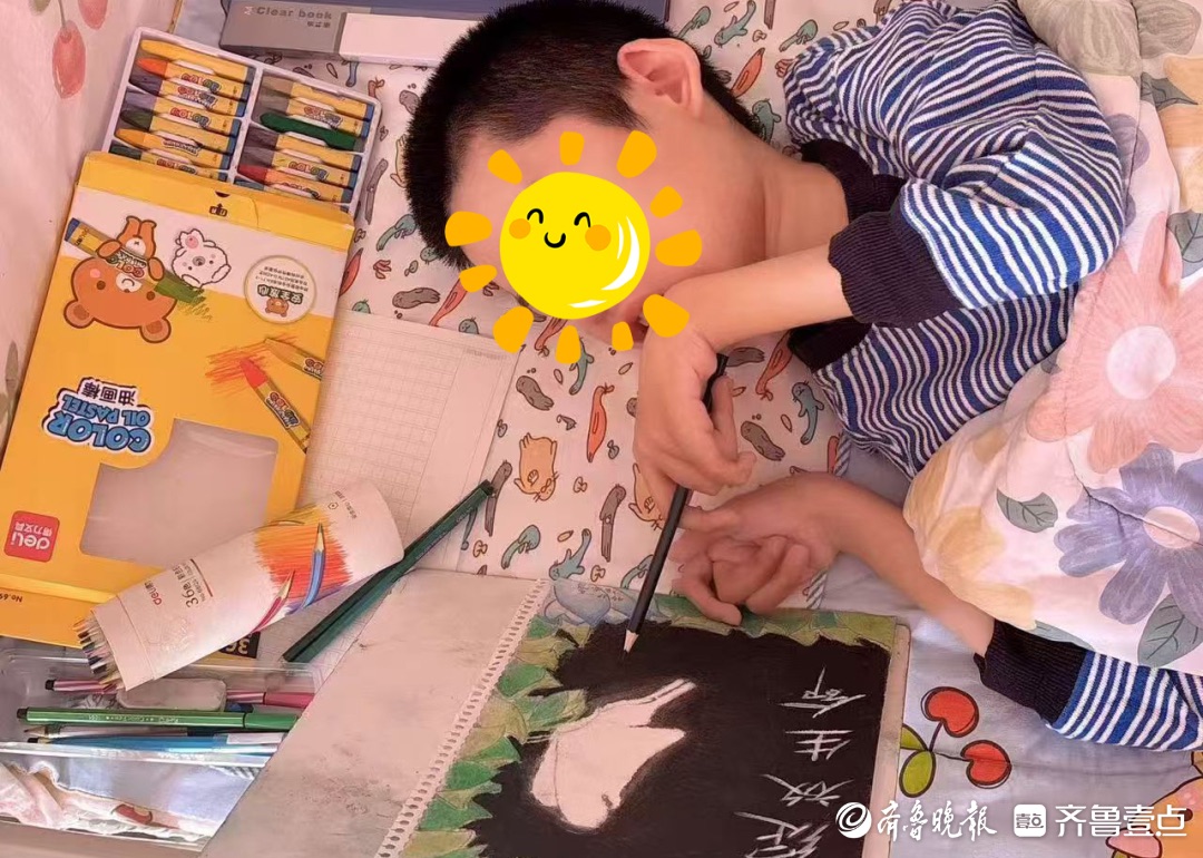 在“亲亲妈妈”一日复一日的呵护和陪伴下,鸣鸣突破身体的禁锢,学会识字、阅读、写诗、绘画、下棋。用全身仅能动的两根手指捏紧手中的笔,以文字记录着“福娃”对疾病的不屈与抗争,用色彩描绘着“福娃”在新时代幸福生活的美好景象。