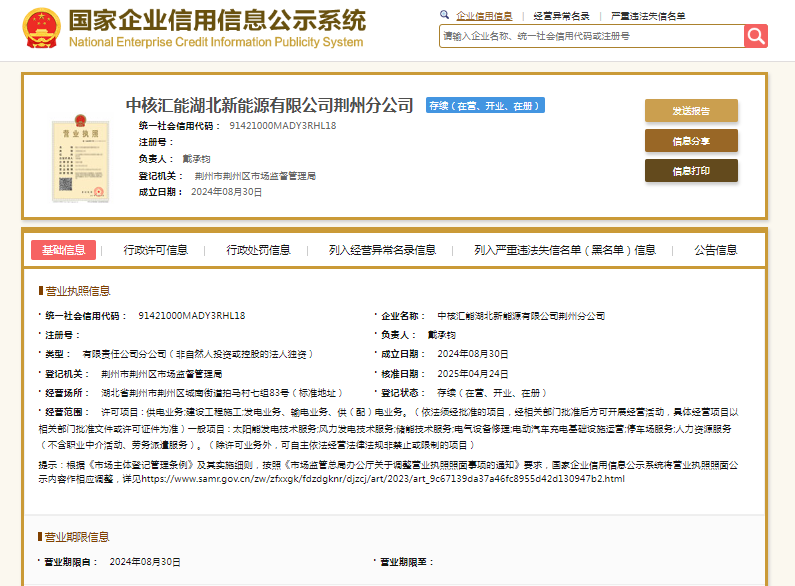 国家企业信用信息公示系统显示,中核汇能湖北新能源有限公司荆州分公司成立于2024年,负责人戴承钧,其母公司为中核汇能湖北新能源有限公司,成立于2023年,法定代表人亦为戴承钧,注册资本1000万元人民币,由中核汇能有限公司全资持股。中核汇能有限公司则成立于2011年,法定代表人张焰,注册资本286481.1246万元人民币。