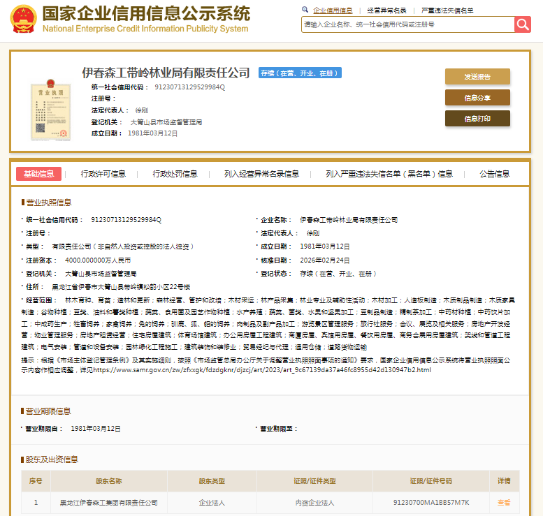 国家企业信用信息公示系统显示,伊春森工带岭林业局有限责任公司成立于1981年,注册资本4000万元人民币,法定代表人徐刚,由黑龙江伊春森工集团有限责任公司全资持股,后者则由黑龙江省人民政府全资持股。