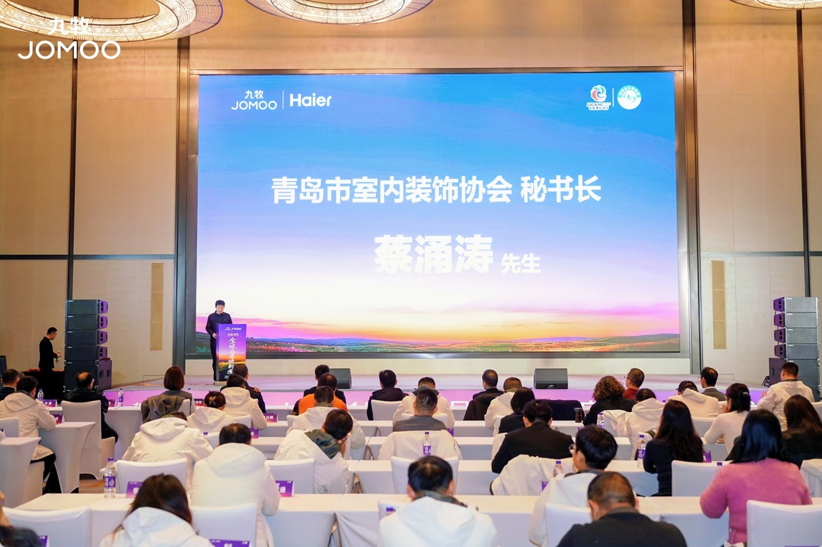 会议开幕致辞环节 青岛市室内装饰协会秘书长蔡涌涛 秘书长表示,家居装饰行业目前已经发展成为事关千家万户美好生活、备受社会瞩目的庞大产业。2025年协会在市商务局的领导下圆满完成了青岛市家装厨卫国补商品信息数据库的审核、录入工作,为青岛市以旧换新工作推进做出了应有的贡献。此次九牧、海尔两大家居行业龙头企业强强联手继续相应国家消费品以旧换新政策,相信此次活动双方厂家必将为广大消费者提供 物美质优的家电卫浴产品。