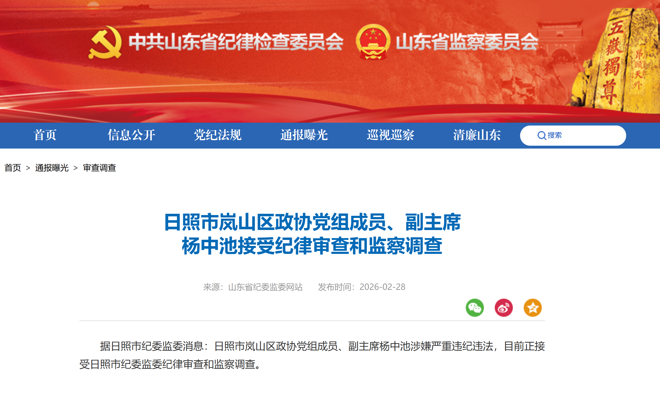 山东省纪委监委网站2月28日消息,日照市岚山区政协党组成员、副主席杨中池涉嫌严重违纪违法,目前正接受日照市纪委监委纪律审查和监察调查。