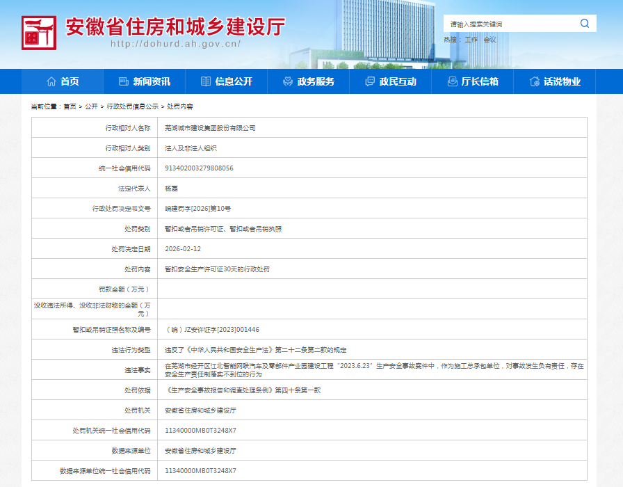 齐鲁晚报·齐鲁壹点记者于安徽省住房和城乡建设厅官网获悉,2月12日,芜湖城市建设集团股份有限公司(下称“芜湖城建集团”)因对一起生产安全事故负有责任,收到暂扣安全生产许可证30天的行政处罚,处罚机关为安徽省住房和城乡建设厅。