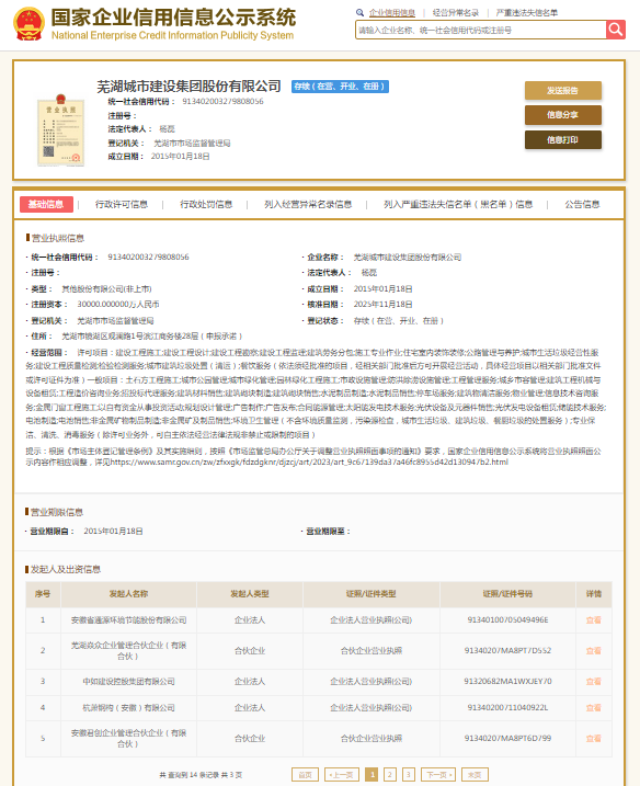 国家企业信用信息公示系统显示,芜湖城市建设集团股份有限公司成立于2015年,注册资本30000万元人民币,法定代表人杨磊,大股东为安徽中江城建集团有限公司。