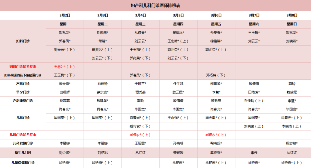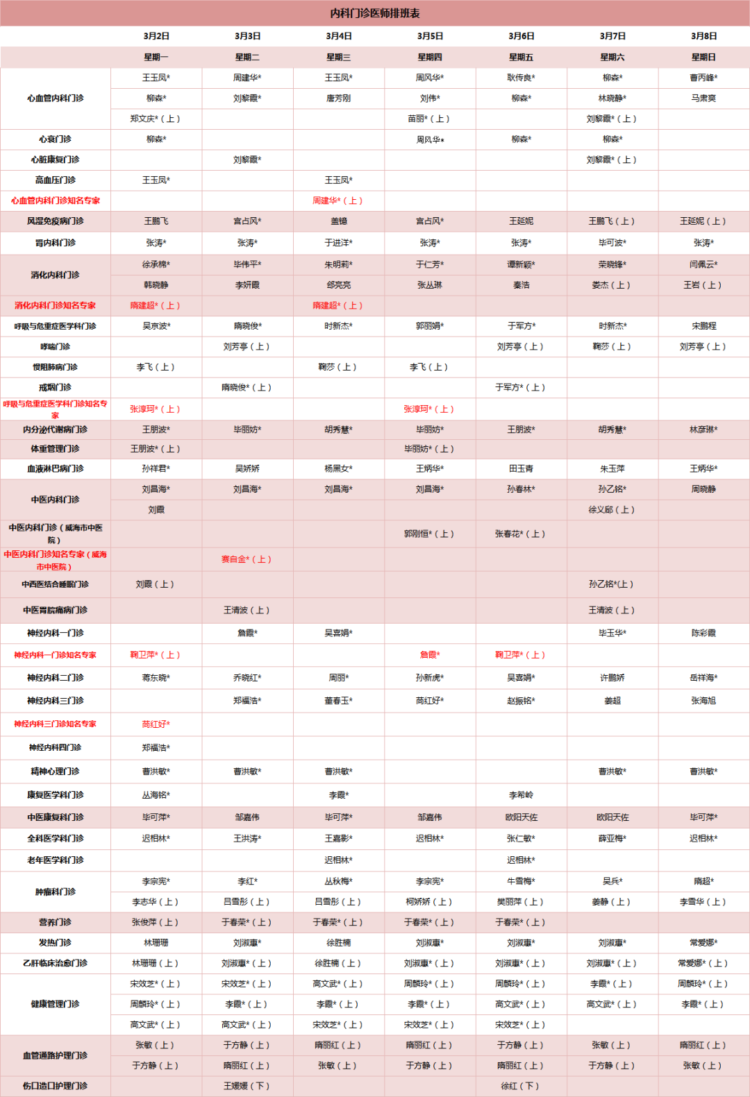 出诊信息丨威海市中心医院门诊排班表(3.2-3.8)