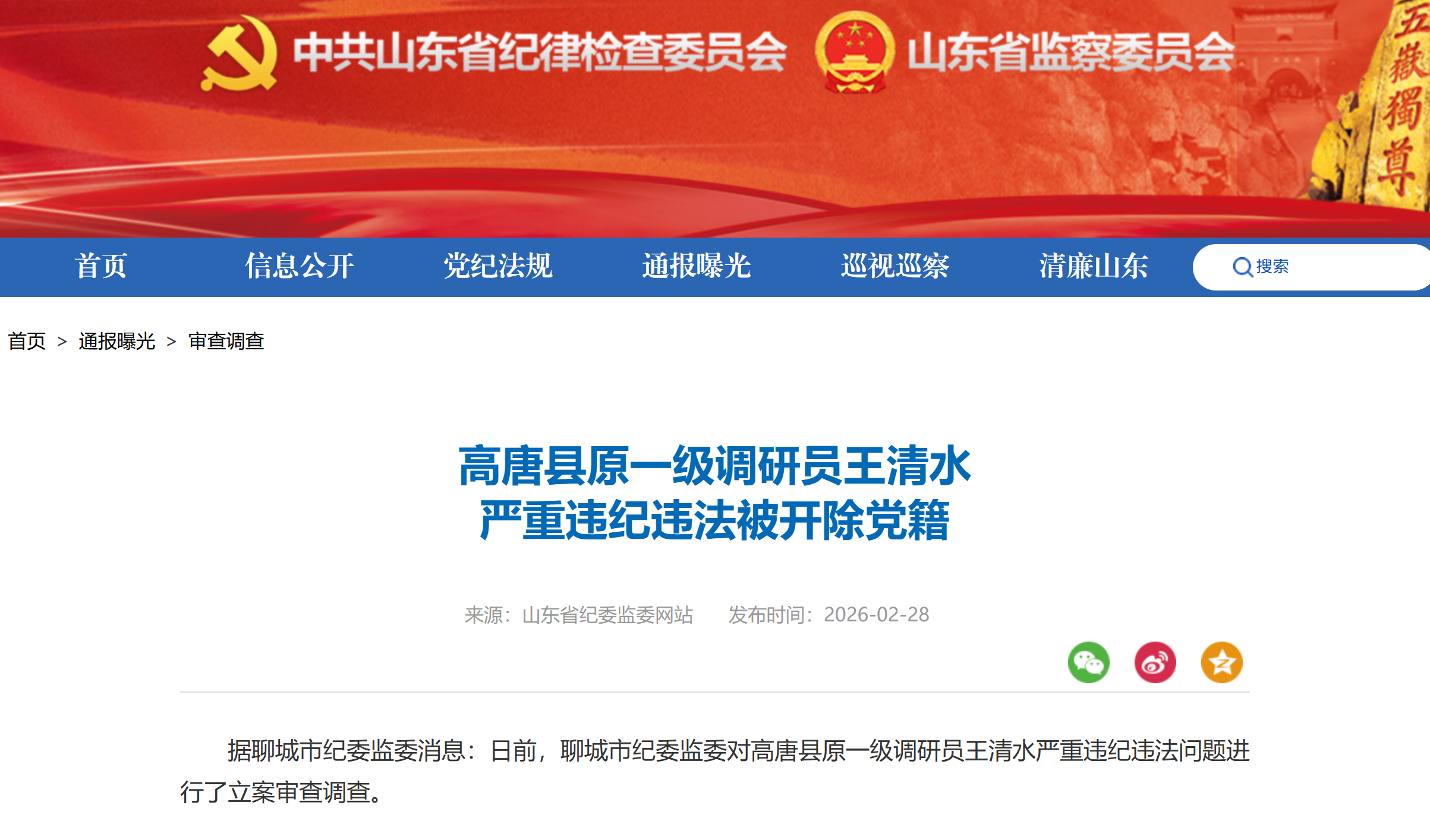 山东省纪委监委网站2月28日消息,高唐县原一级调研员王清水严重违纪违法被开除党籍。