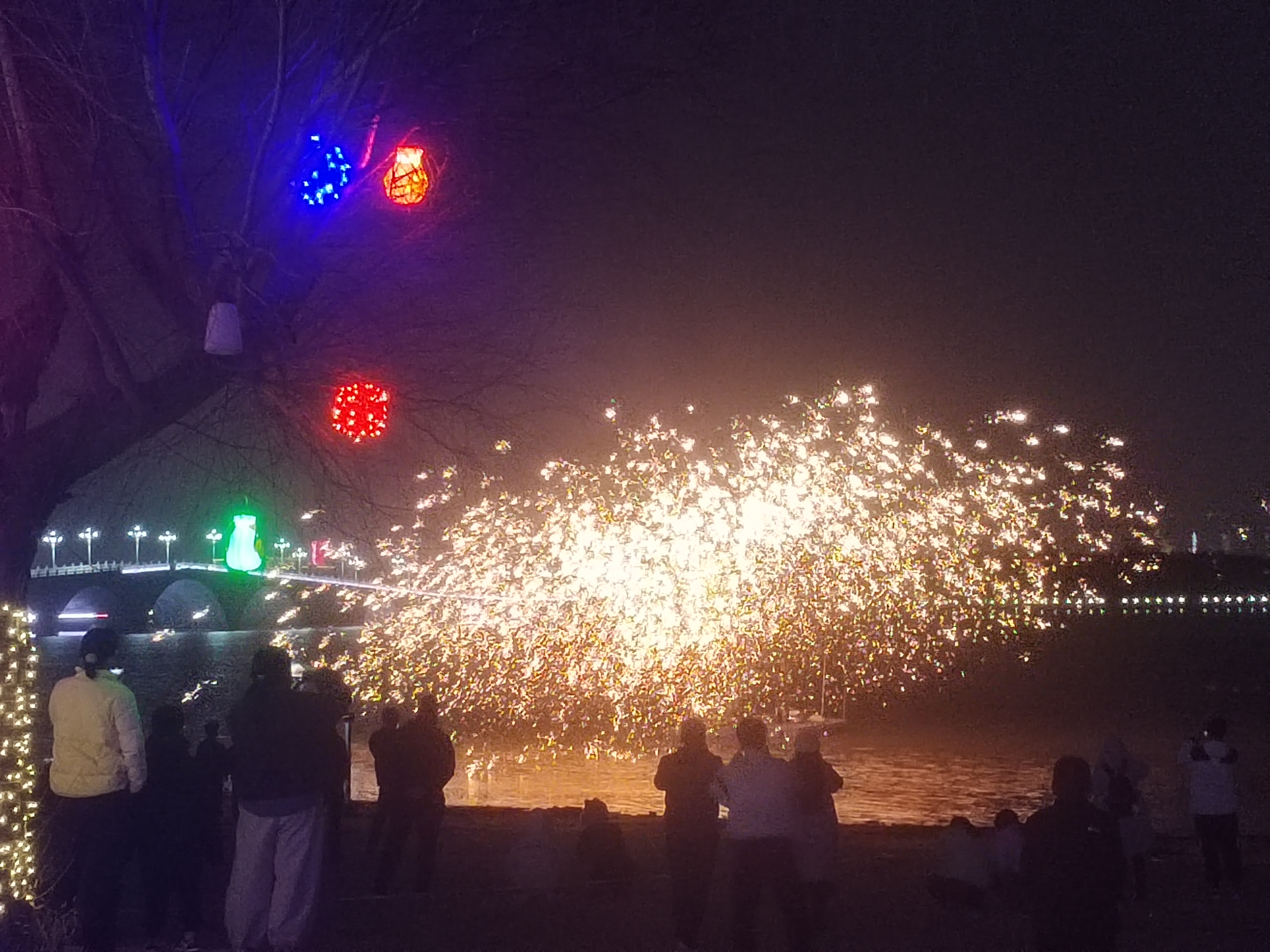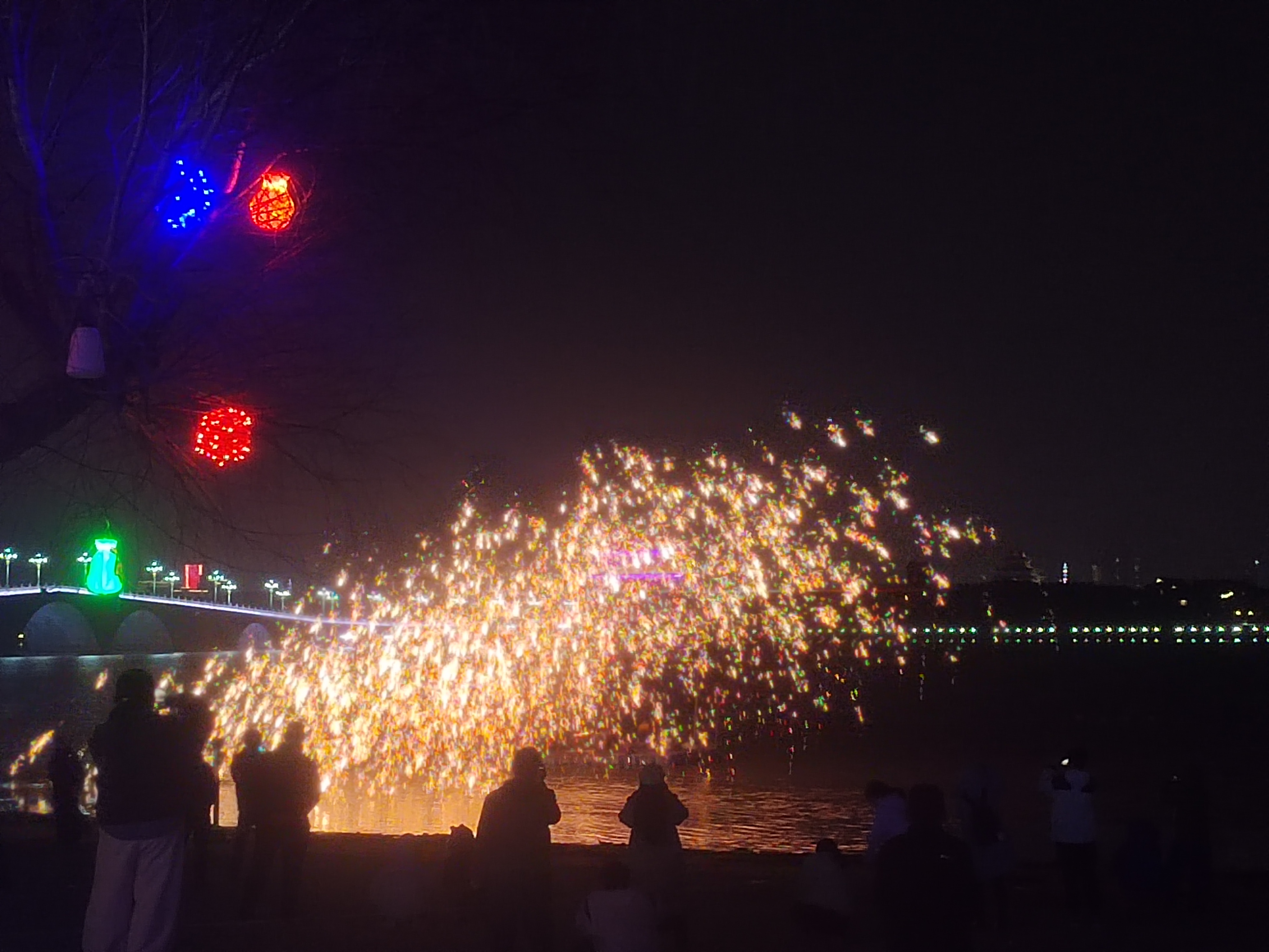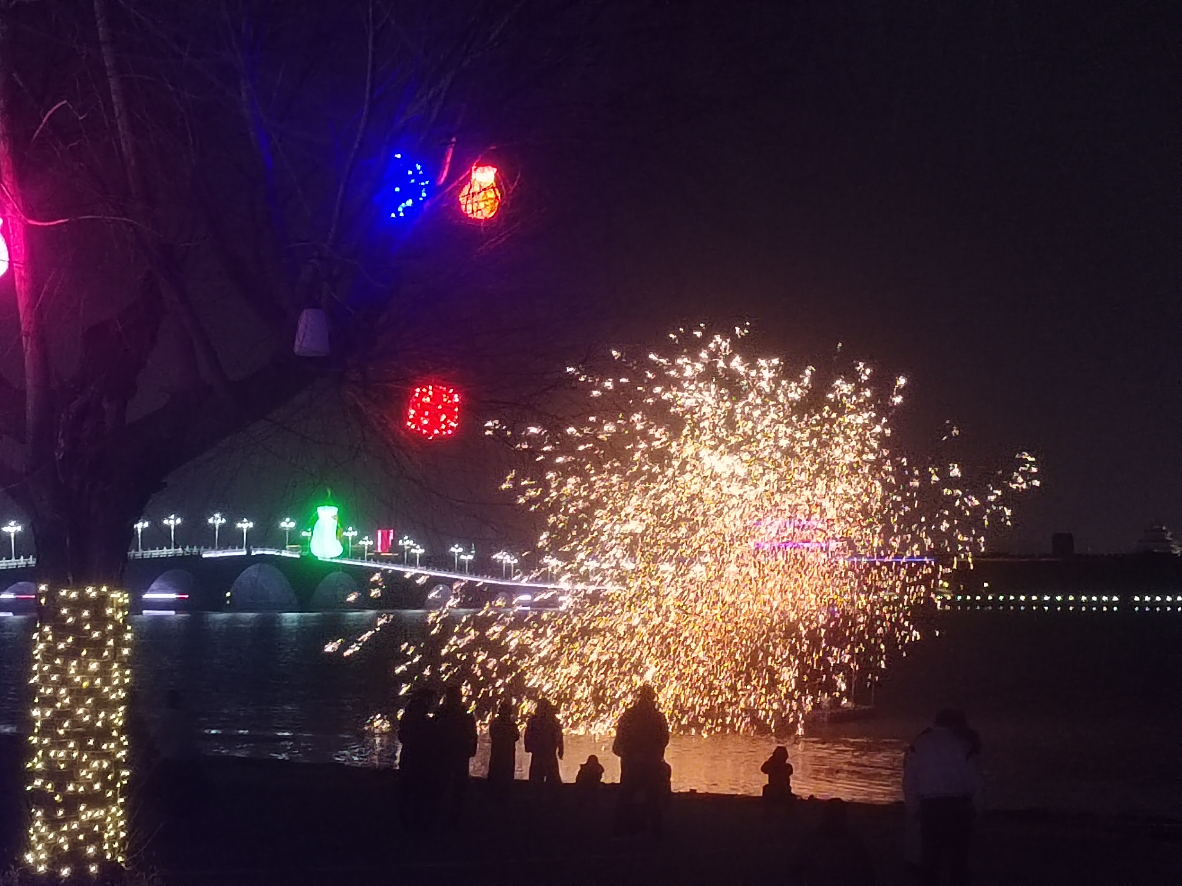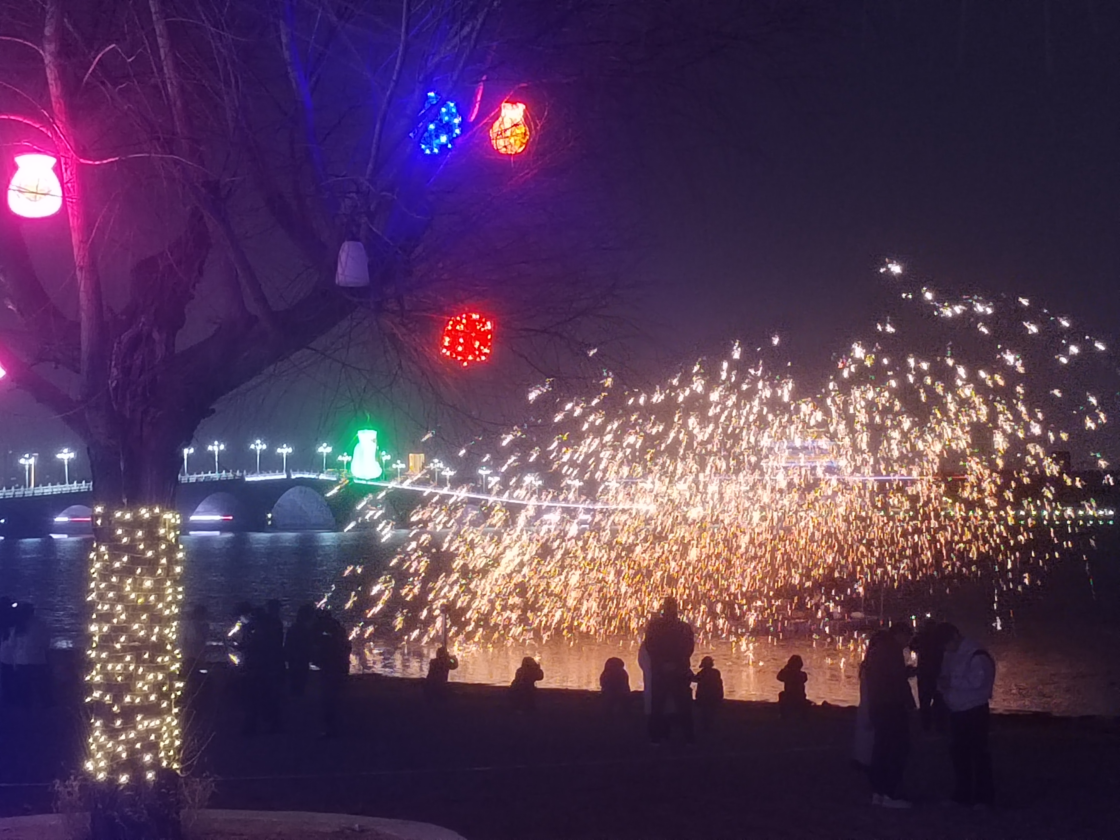 千年传承打铁花,闪亮登场聊城湖畔,火红之花绽于夜空,似流星雨洒落,美不胜收,成为马年盛宴。(宇川科技驻山东办事处聊城宋仕行)