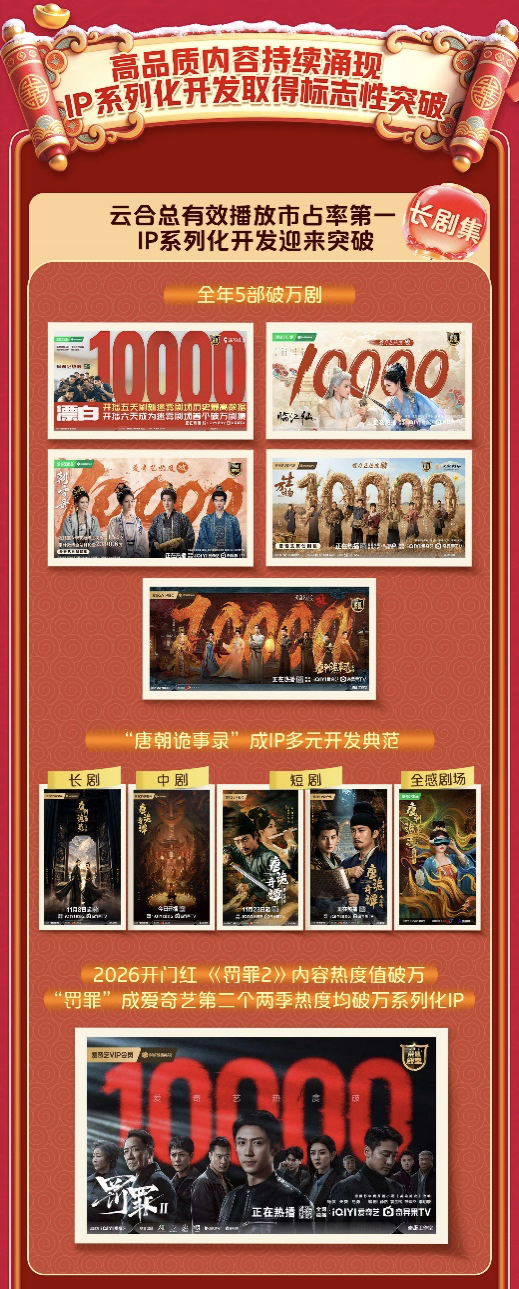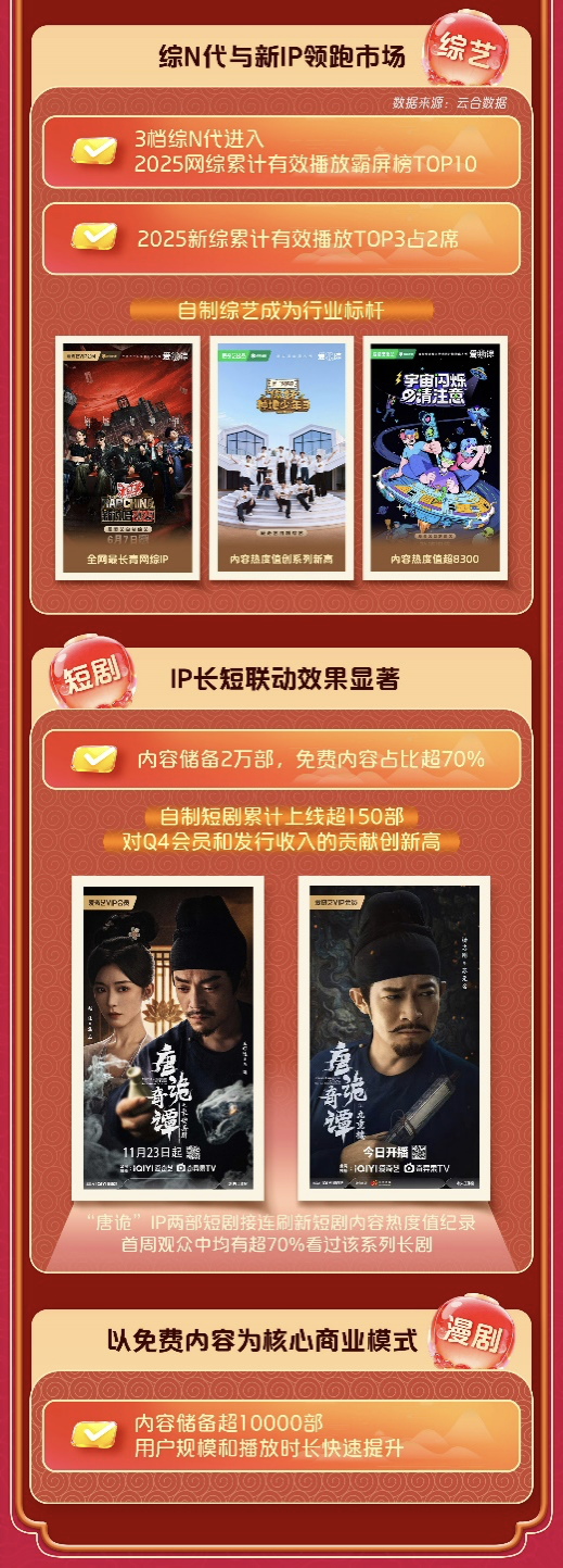 内容是爱奇艺发展的基石。长剧集方面,第四季度优质内容持续涌现,爱奇艺稳居云合剧集总有效播放市占率第一,IP系列化开发迎来突破。《唐朝诡事录》成为首个连续两季作品内容热度值破万的IP,《唐朝诡事录之长安》在2025年新上线剧集中广告收入表现第一,会员收入表现第二。短剧《唐诡奇谭之长安县尉》和《唐诡奇谭之九重楼》接连刷新短剧内容热度值记录。两部短剧首周观众中,均有超70%看过该系列长剧,显示多样化的内容形态有效延展了IP生命周期。2026开年,警匪刑侦剧《罚罪2》内容热度值破万,“罚罪”成为爱奇艺第二个两季内容热度值均破万的系列化IP。