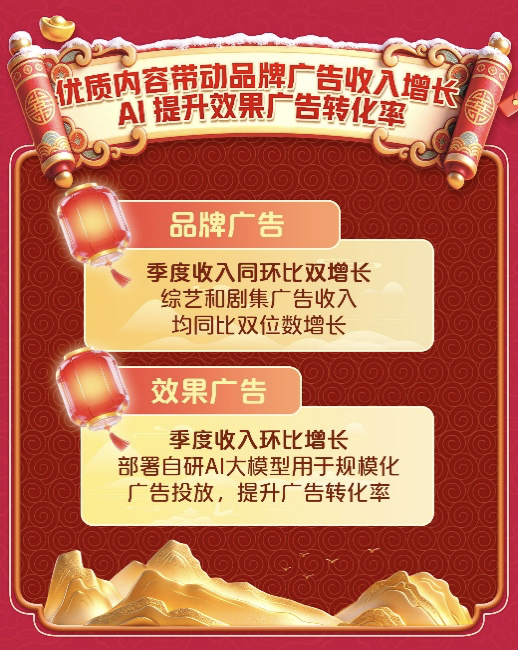 会员服务之外,第四季度在线广告服务收入13.5亿元,环比增长9%。其中,品牌广告收入同环比双增长,综艺和剧集的广告收入均实现同比两位数增长。效果广告收入实现环比增长,通过部署自研AI大模型用于规模化广告投放,提升广告转化率。当季,内容发行收入7.9亿元,其他收入为5.5亿元。