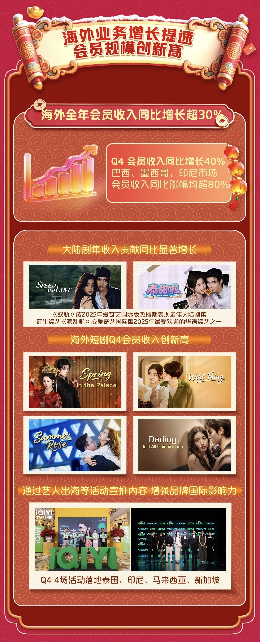 爱奇艺海外业务总裁杨向华在当天的财报电话会上表示, 2026年海外业务整体策略是实现收入继续高比例增长。以大陆剧集为核心同时加大泰国、马来西亚、印尼本土内容的自制与采购,并通过艺人出海等市场活动宣推内容,增强爱奇艺在国际市场的品牌影响力。