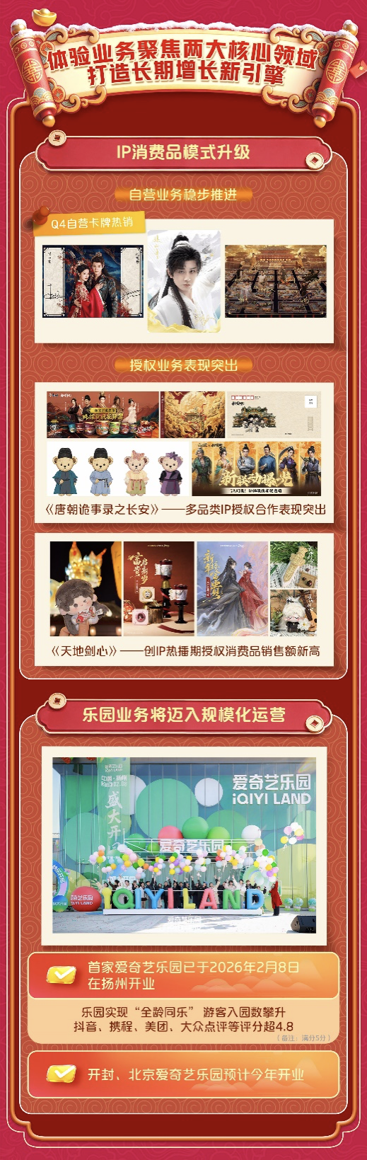 依托丰富的IP资产,爱奇艺正以IP消费品和爱奇艺乐园为核心,将体验业务打造成可持续增长的新引擎。
