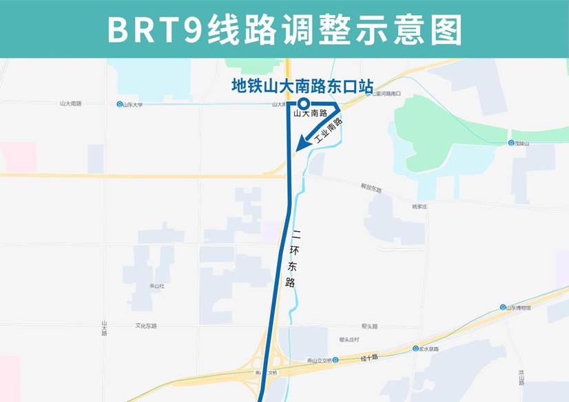 BRT9号线调整后由大涧沟北开往地铁山大南路东口站,沿二环东路向北,然后单向沿山大南路向东、工业南路向西至二环东路向南恢复原线,沿途增设二环东路和平路(BRT)、甸柳庄(BRT)、二环东路工业南路(路东)、地铁山大南路东口站(路南)、工业南路西口(路北)站点。BRT9号线大涧沟北发车时间为5:50-21:30;地铁山大南路东口站发车时间为5:50-21:30。线路调整后,将进一步加强沿线区域与地铁6号线的衔接。