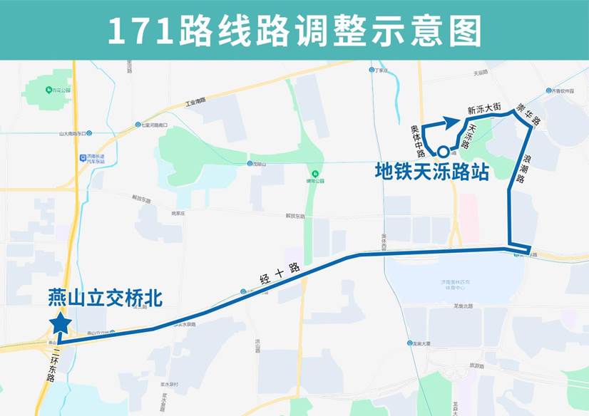 171路调整后由燕山立交桥北开往地铁天泺路站,沿二环东路向南、经十路向东、浪潮路向北、崇华路向北、新泺大街向西,然后单向沿天泺路向南再向西、奥体中路向北至新泺大街向东恢复原线,沿途增设燕山立交桥北、地铁燕山立交桥站(路北)、浪潮路南口(路西)、省干部学院(路西)、雅居园小区南门(路西)、雅居园小区(路西)、雅居园小区北门(路南)、地铁天泺路站(路北)、燕山新居北(路东)、新泺大街奥体中路(路南)站点,撤销青年桥、经八路青年西路(路北)、青年西路(路东)、经八路胜利大街、经十纬一(路南)、纬一路经十路(路东)、省体育中心、全民健身中心、地铁泉城公园站、经十路舜耕路、千佛山、经十路历山路、千佛山医院、地铁山师东路站、经十路燕子山西路、经十路山大路、经十路燕子山路、燕山立交桥西、新泺大街奥体中路(路北)、燕山新居北(路西)、省立医院东院区(路西)、奥体中路经十路(路西)站点。171路燕山立交桥北发车时间为6:00-21:00;地铁天泺路站发车时间为6:00-21:00。