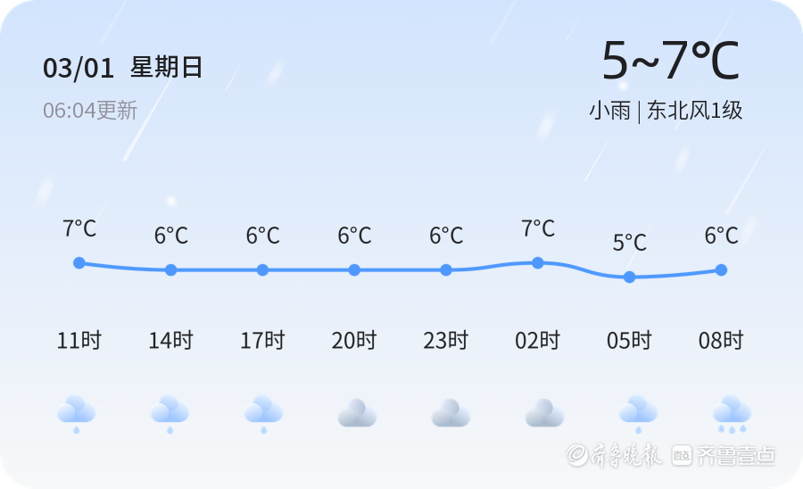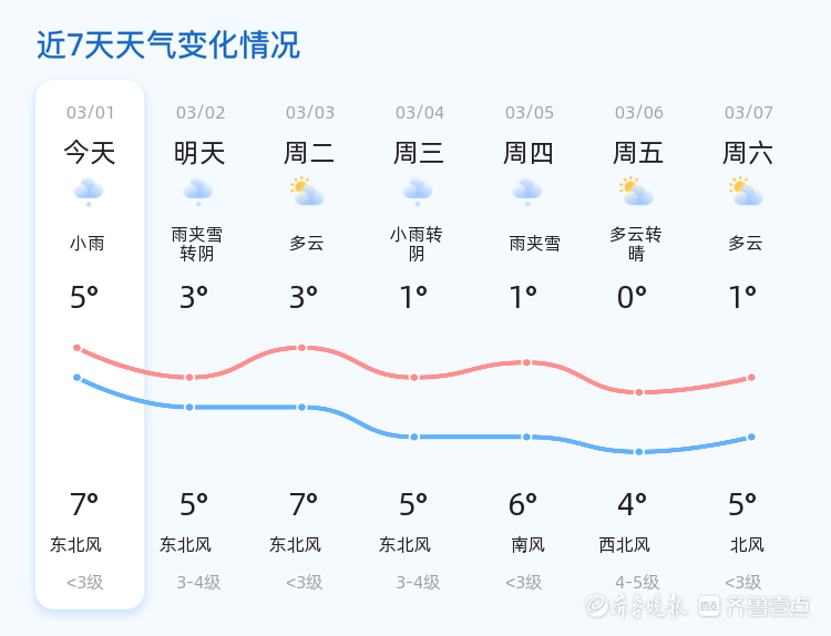 今日是2026年3月1日,农历正月十三,威海市迎来小雨天气。气温在5℃至7℃之间,东北风1级,空气湿度达到100%。各区普遍出现小雨,市民出行需携带雨具,注意交通安全。PM2.5指数为109,建议敏感人群减少外出,做好防护措施。明日天气与今日相比将有所变化,预计明日为雨夹雪转阴,气温将降至3℃至5℃,东北风风力增大至3-4级。市民需关注天气变化,及时增添衣物,防范道路湿滑带来的出行风险。未来三天,威海市天气将呈现多变趋势。周三可能出现小雨转阴,气温维持在1℃至5℃,东北风3-4级。周四雨夹雪天气,气温1℃至6℃,南风风力较小。周五多云转晴,气温0℃至4℃,西北风4-5级。市民需关注天气预报,提前做好出行和生活安排,特别是防范大风和降温带来的影响。温馨提示