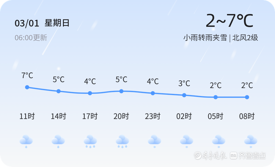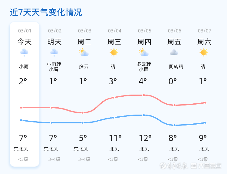今天是2026年3月1日,星期日,农历正月十三。济南市迎来小雨转雨夹雪天气,气温在2℃至7℃之间。各区普遍出现降雨天气,市民出行需携带雨具,注意防寒保暖。当前空气质量指数为135,湿度高达96%,建议敏感人群减少外出。明天(3月2日)济南市天气为小雨转小雪,气温在1℃至7℃之间,风力较今日有所增强,东北风3-4级。与今日相比,明日降雪可能性增加,市民需注意防范道路湿滑。未来三天(3月3日至5日),济南市天气以多云为主,气温将出现波动,最低气温1℃,最高气温可达12℃。提醒市民及时关注天气变化,合理调整着装。特别提示雨雪天气可能导致道路结冰,行车需减速慢行,确保安全。温馨提示