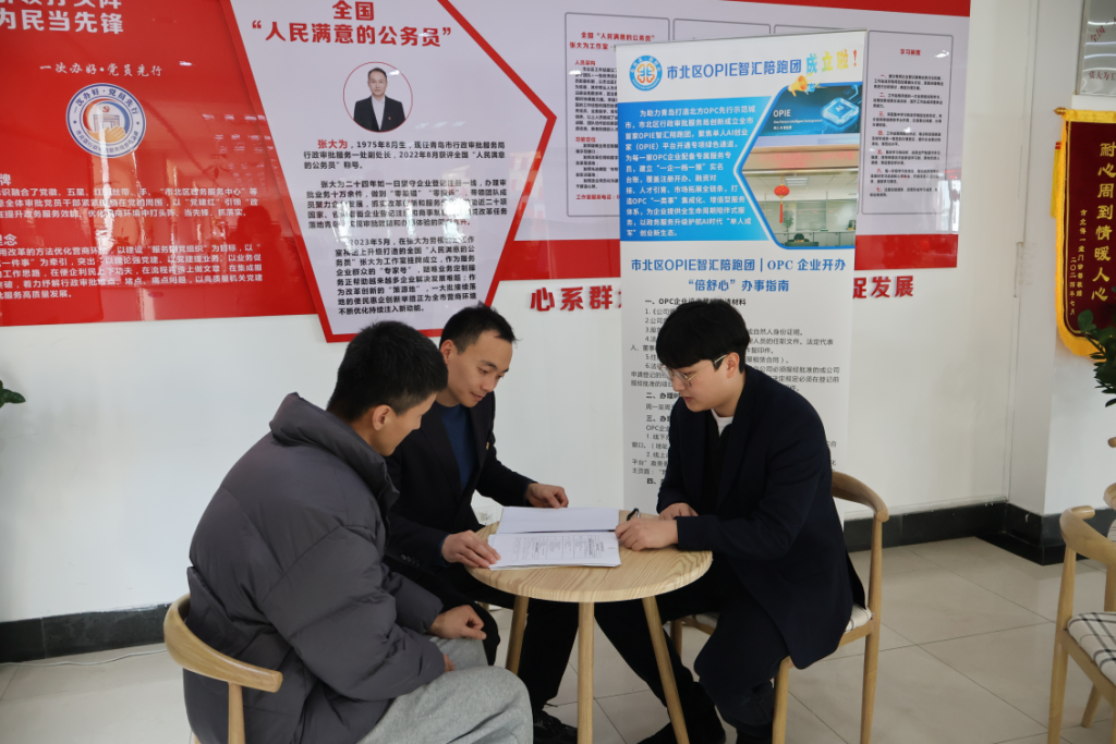 三天后,赤鸟(青岛)数字科技有限公司在市北区行政审批服务大厅领取了马年第二张OPC营业执照。28日,青岛趣派网络有限公司和青岛海智美科拉有限公司分别在此领取了第三张和第四张OPC营业执照。