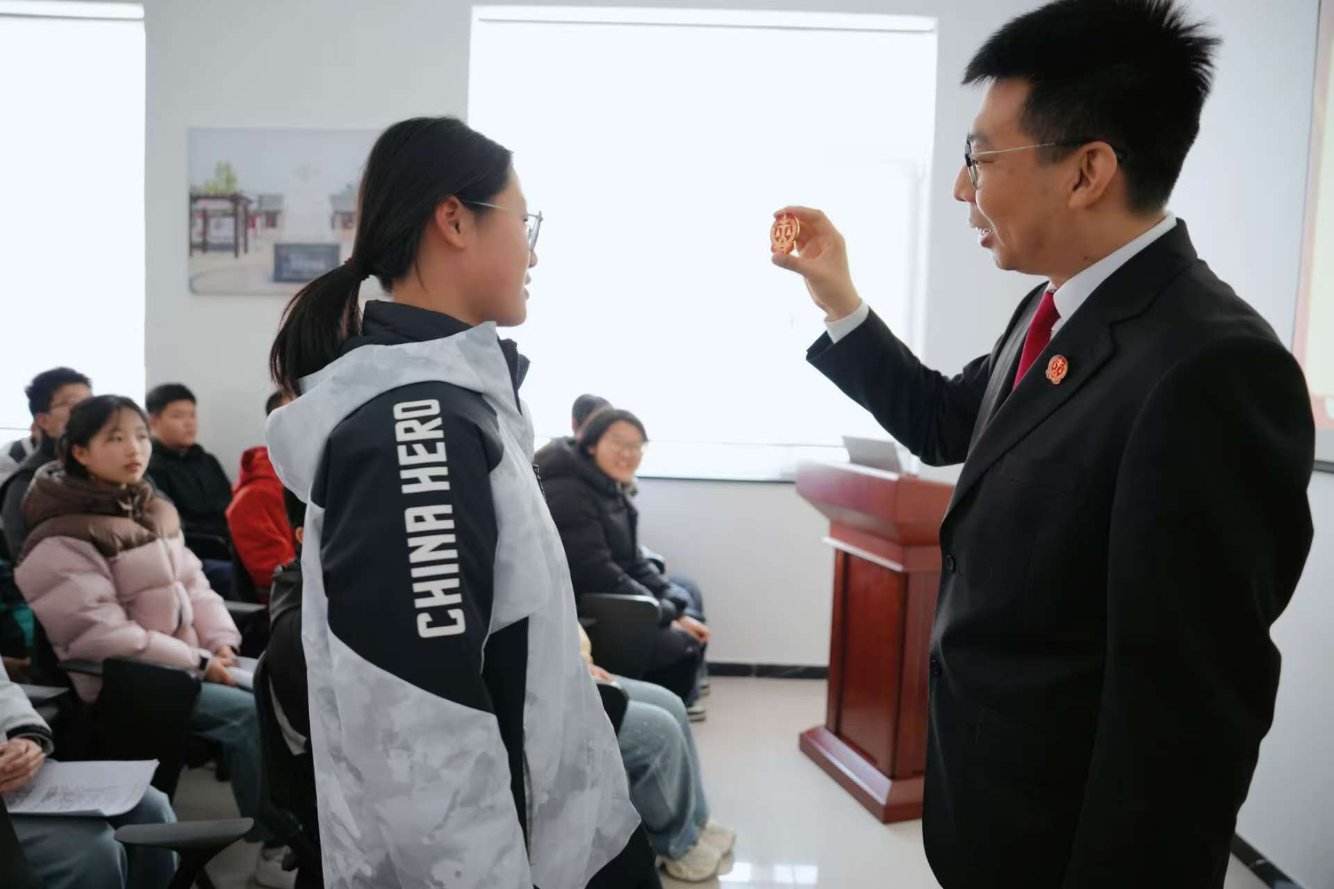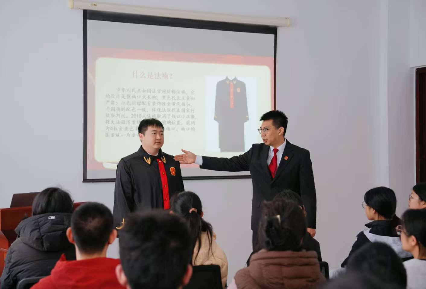 参观结束后,一场精彩的普法小课堂在法庭内开讲。“大家看,法徽上的图案是什么?”“没错,是代表公平正义的天平,法官胸佩法徽,就是要时刻提醒自己,把公平正义放在离心脏最近的地方。”法院干警围绕法徽、法袍、法槌的深刻寓意与具体用途进行细致讲解,并对即将开展的模拟法庭活动进行简要介绍和角色分工,同学们认真聆听、踊跃互动,现场气氛热烈。