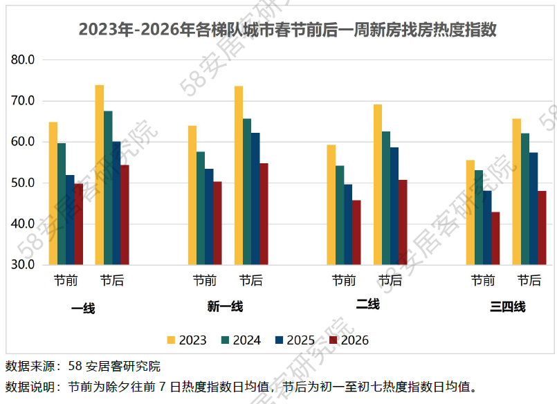 58安居客研究院报告数据显示,2026年春节后7天(初一至初七),三四线城市新房找房热度环比节前7天(除夕前七日)上升11.6%,三四线城市因热度基数较低,加上少量返乡置业,成为环比涨幅最高的梯队,印证了春节假期对下沉市场购房需求的激活作用。