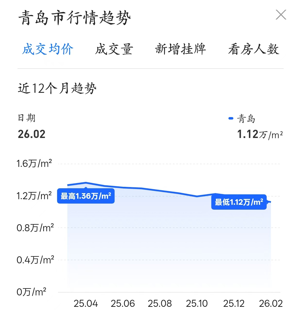 近12个月青岛二手房成交价趋势。来源:贝壳交易平台