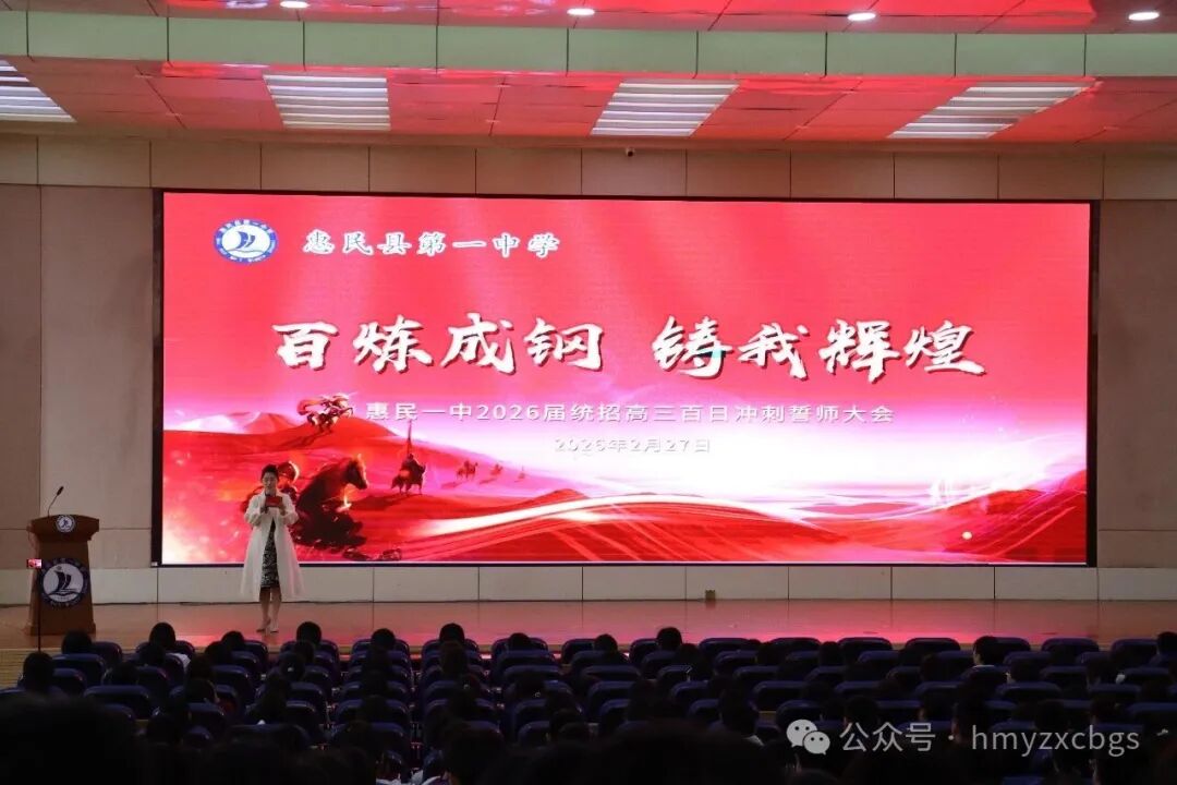 2月27日,惠民一中东校区大报告厅、小报告厅及西校区报告厅内气氛庄严而热烈,全体高三师生及家长代表齐聚一堂,共同见证“2026届高三百日冲刺誓师大会”的盛大举行。大会通过励志演讲、宣誓仪式、授旗助威等环节,为高三学子注入冲刺动力,吹响了向高考发起总攻的号角。