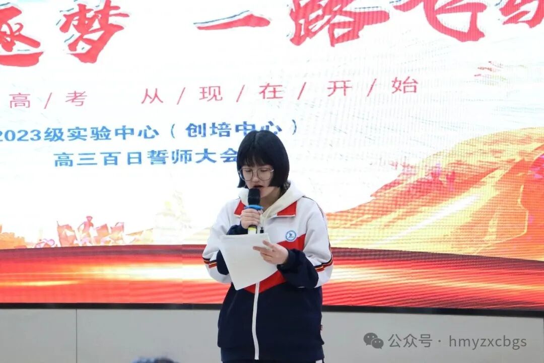 学生代表刘雅萌、任梓烁、魏子宸同学分享学习经验、立下拼搏誓言。他们提到:“从清晨的朗读到深夜的台灯,从模拟考的跌倒与爬起到如今的坚定前行,我们从未放弃。高考不是终点,而是通向更广阔世界的起点。”随后田欣语同学带领实验中心全体高三学子宣誓:“我以青春之名宣誓:不负父母期望,不负老师教诲,不负青春韶华!百日冲刺,我必成功。”