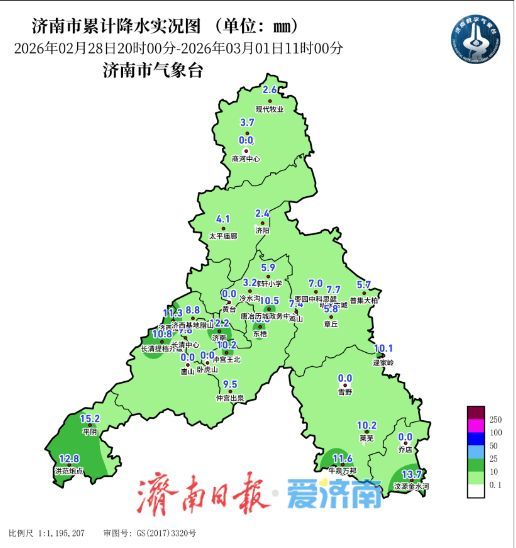 受冷空气和暖湿气流的共同影响,28日夜间至3月1日上午济南市出现小到中雨,北部地区和山区出现雨夹雪或雪,28日20时至1日11时全市平均降水量6.7毫米。
