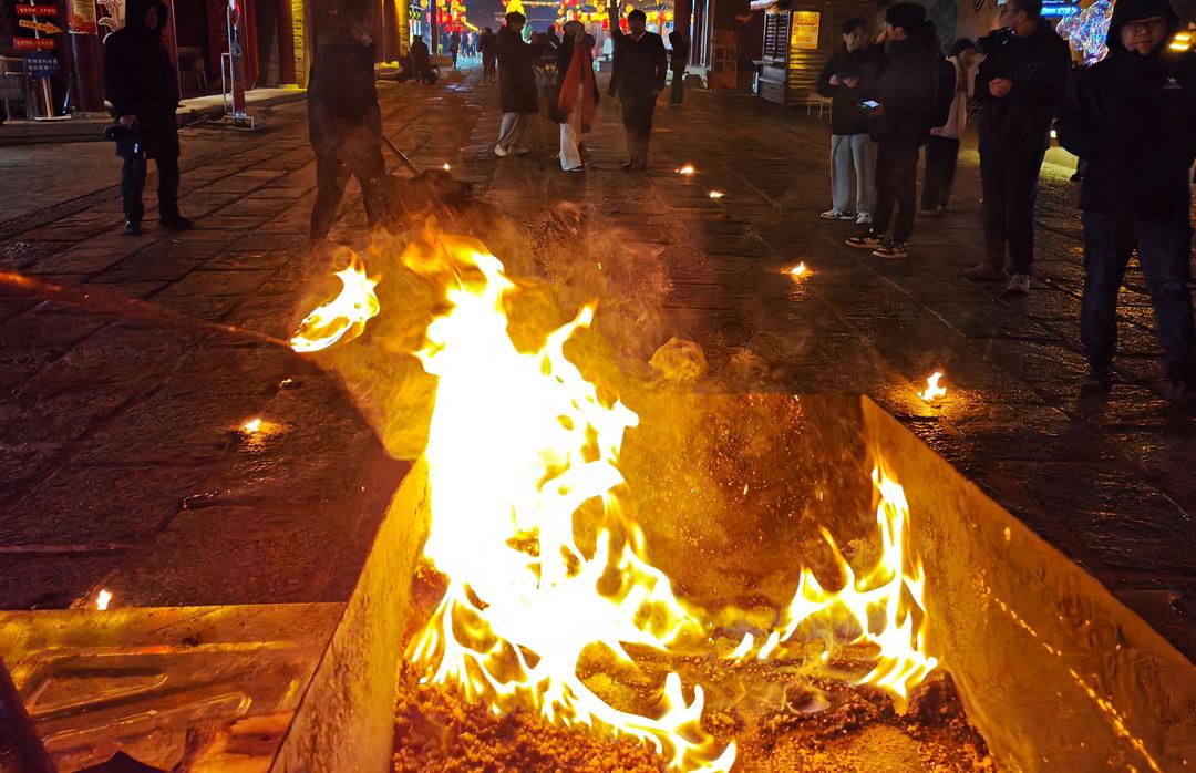 人们,特别是孩子们,依次上前,小心翼翼地用铁锨将燃烧的油沙包轻轻地放在中心街两侧,随着多个火点排列成行到最后形成火龙,点亮了大家对新一年的美好期盼。星星点点燃烧的油包和载歌载舞的人们构成了一幅温馨动人的画面。除了祭海拨灯,现场还穿插了精彩的大秧歌表演,为节日增添了更多色彩。