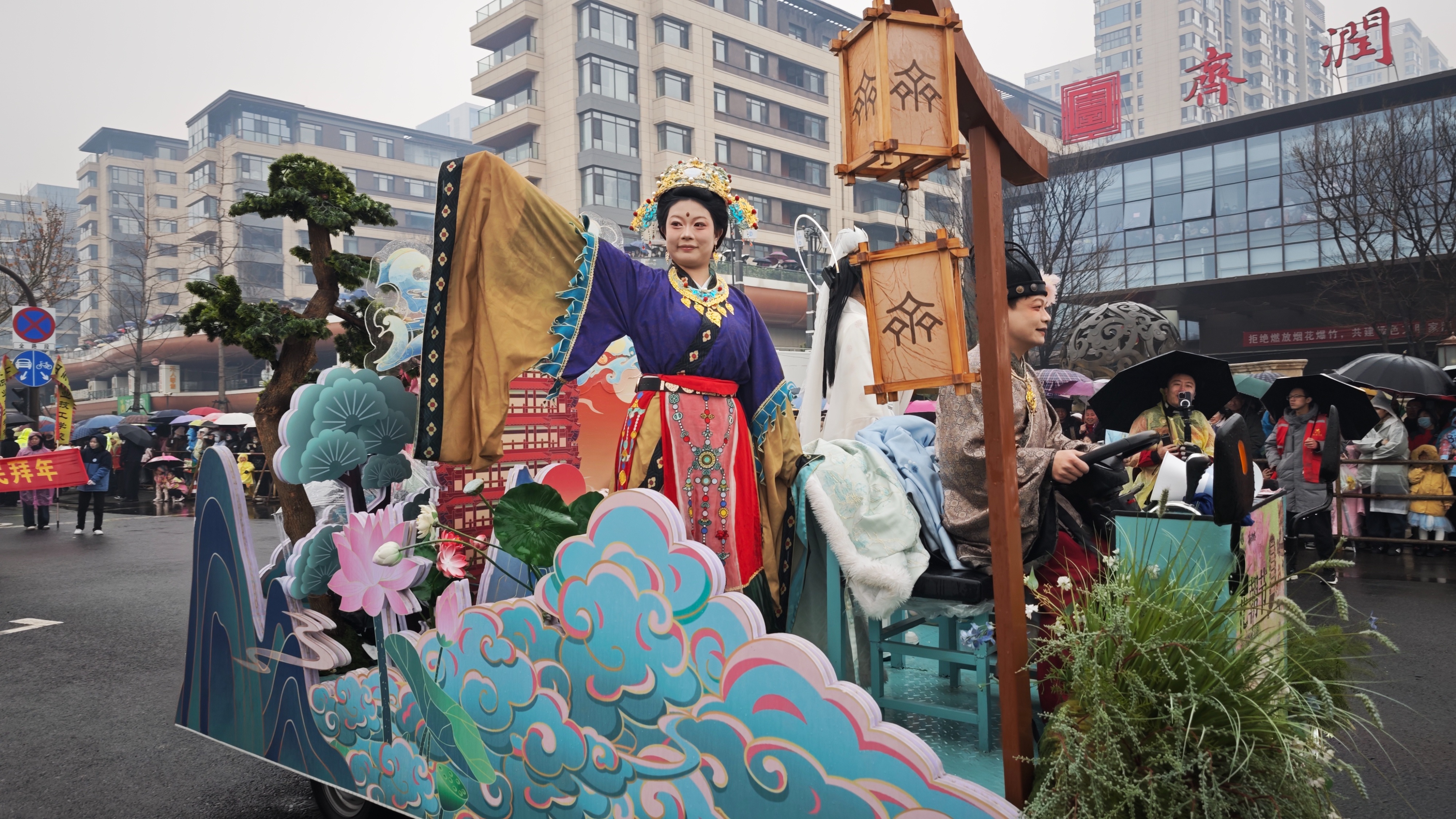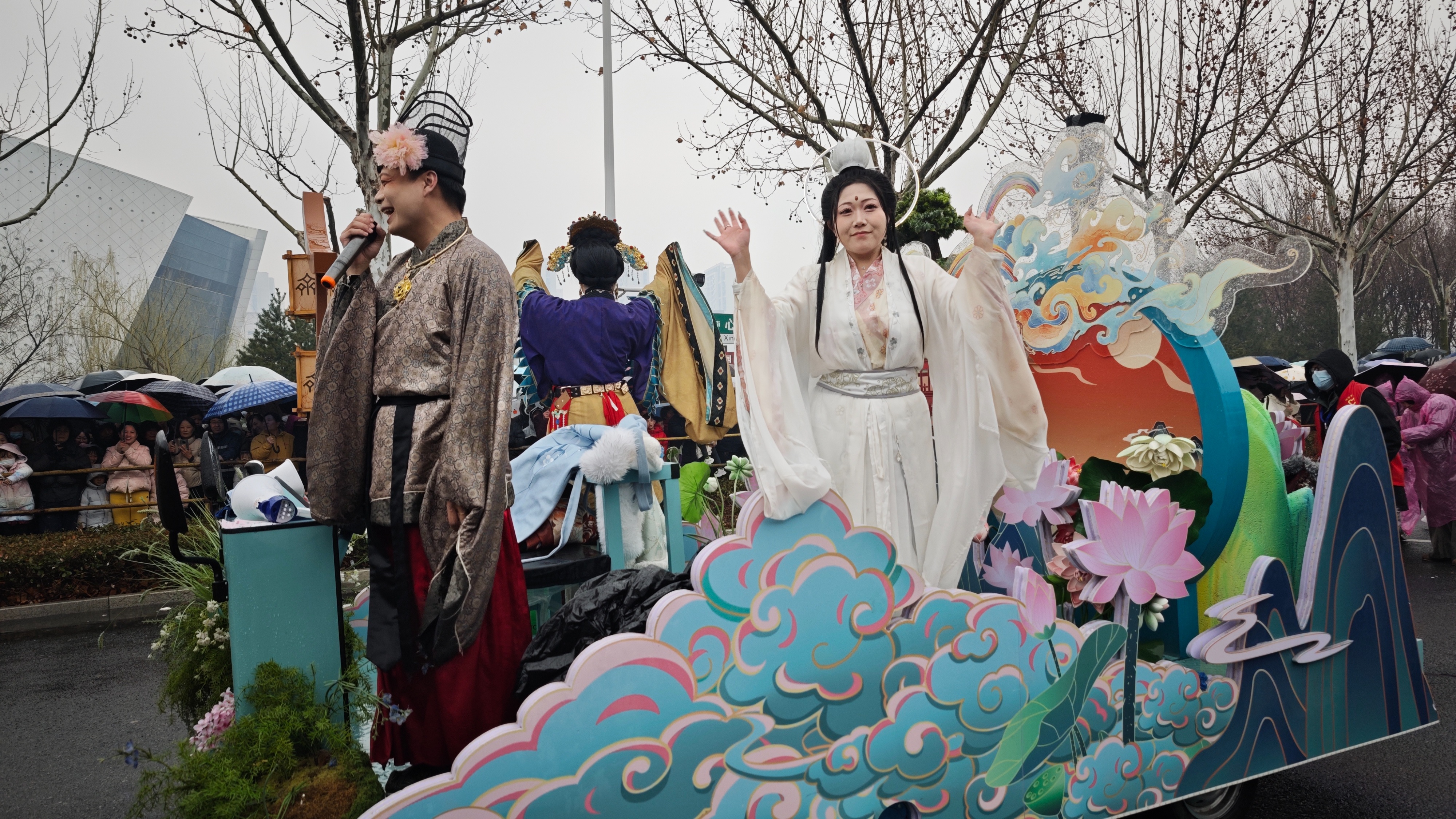 海岱楼钟书阁精心打造主题花车,以“海岱有风 好市发生”为初心,将文旅商融合新业态融入民俗盛会。淡蓝色的车身缀满清雅花簇,祥云霓彩背景板氤氲着仙逸气息,山海灵气与市井热闹完美交融。身着传统华服的NPC沿路互动,化身春日盛会引路者,眉眼间尽显齐风雅韵,举手投足传递市井温情,花车所至之处,成为淄博春日里最动人的风景线,让市民在观赏民俗的同时,感受淄博文旅创新发展的独特魅力。