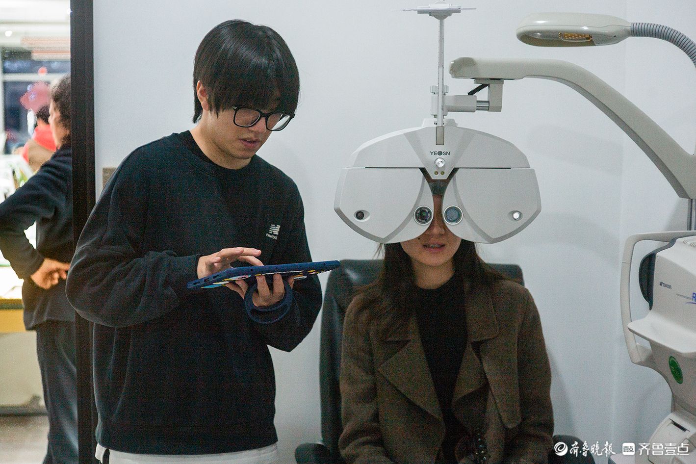 大年初四,济南百亮眼镜(明湖广场)店,工作人员使用综合验光仪为顾客进行验光。春节假期期间,店内客流明显增多,前来验光配镜的顾客数量较平日增长约30%。王剑摄