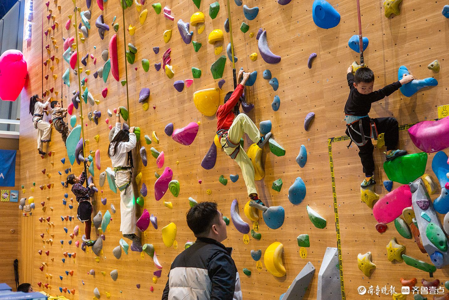 近日,在济南领秀城贵和购物中心,孩子们在室内攀岩馆进行攀爬训练,以运动的方式开启马年新春。