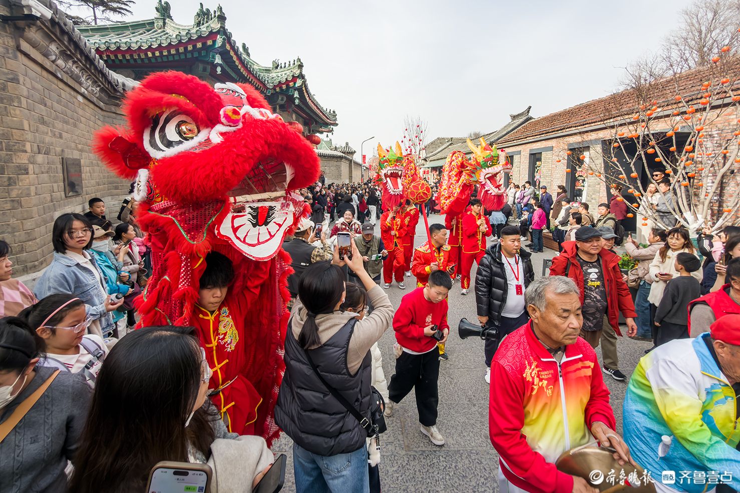 2月21日,在济南上新街,舞狮队伍在百年老街上沿街行进,市民与游客驻足观看并使用手机记录现场。王剑摄