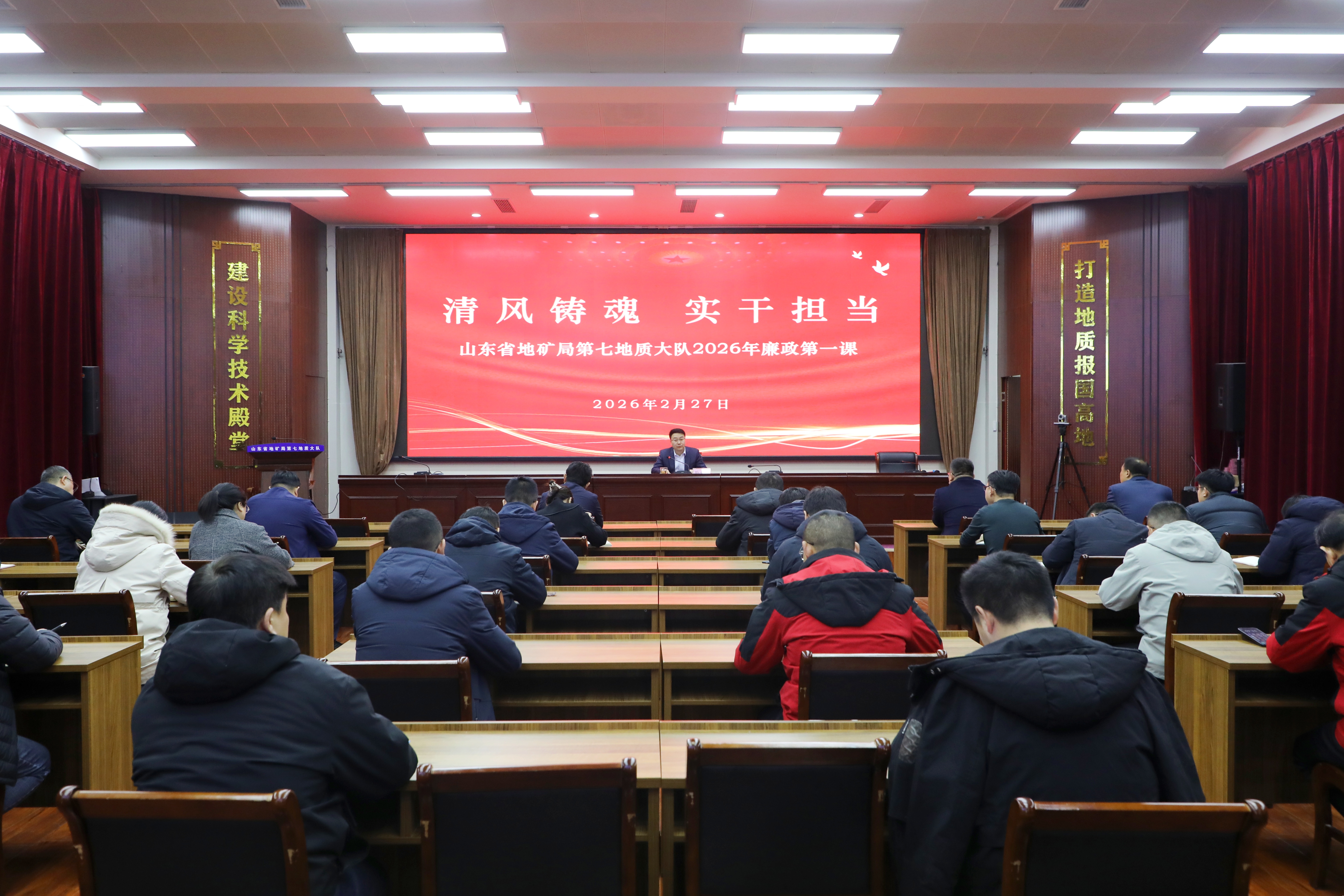 2月27日,山东省地矿局第七地质大队开展2026年廉政第一课。队党委委员、纪委书记孙士伟、机关科室负责人、队属二级单位负责人及内设处室负责人、各支部纪检委员、野外一线技术人员参加会议。