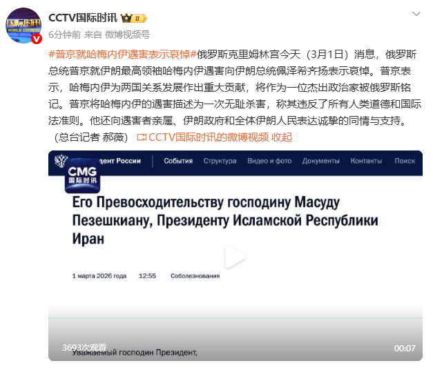 俄罗斯克里姆林宫今天(3月1日)消息,俄罗斯总统普京就伊朗最高领袖哈梅内伊遇害向伊朗总统佩泽希齐扬表示哀悼。普京表示,哈梅内伊为两国关系发展作出重大贡献,将作为一位杰出政治家被俄罗斯铭记。普京将哈梅内伊的遇害描述为一次无耻杀害,称其违反了所有人类道德和国际法准则。他还向遇害者亲属、伊朗政府和全体伊朗人民表达诚挚的同情与支持。